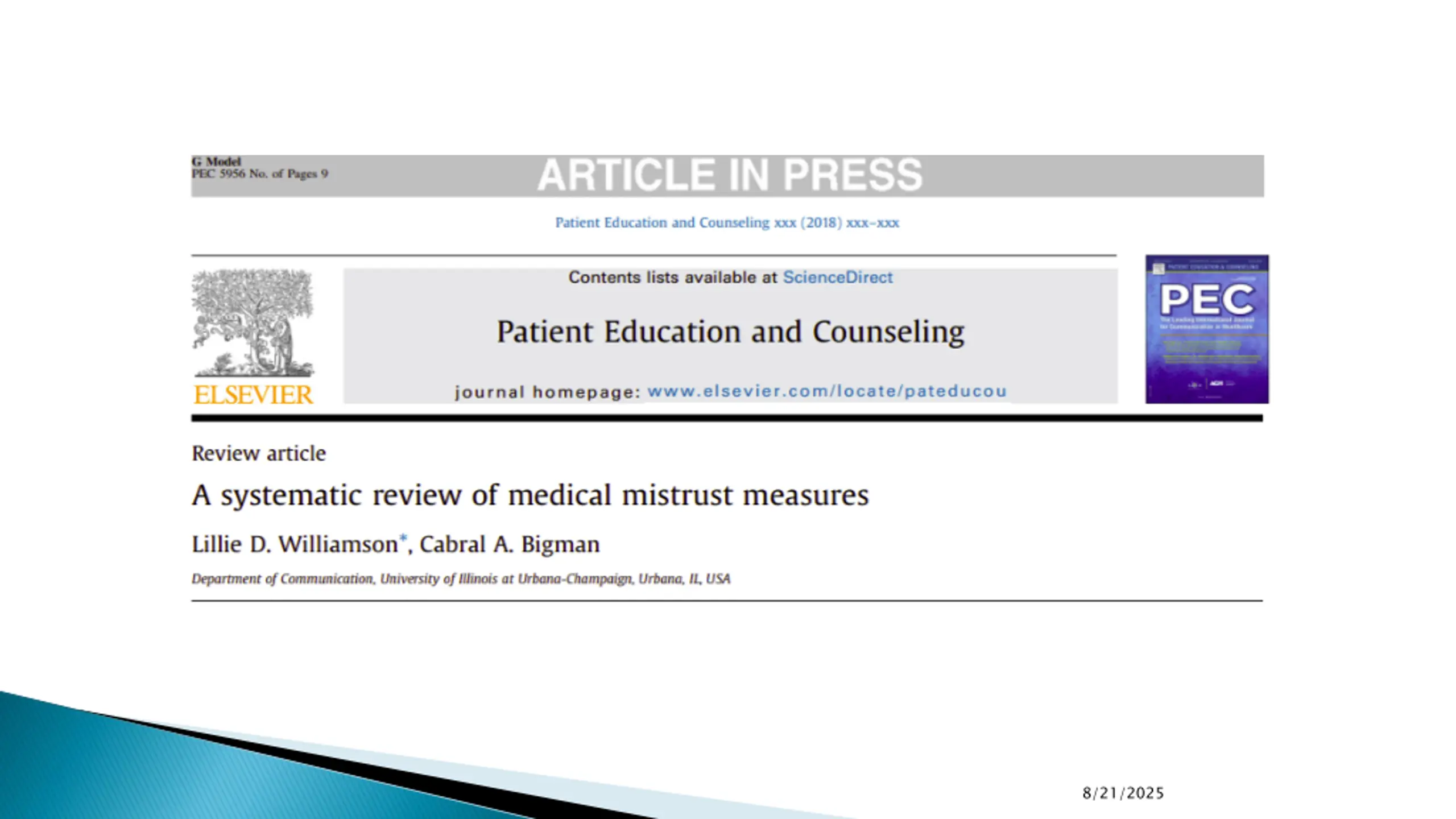 Towards a More Inclusive and Dynamic Understanding of Medical Mistrust Informed: by Science Jessica Jaiswal & Perry N. Halkitis A systematic review of medical mistrust: measures Lillie D. Williamson*, Cabral A. Bigman Department of Communication, University of Illinois at Urbana-Champaign, Urbana, IL, USA Distrust of the Health Care System and Self-Reported Health in the United States: Katrina Armstrong, Abigail Rose,1 Nikki Peters, Judith A. Long, Suzanne Mc Murphy, Judy A. Shea, 8/21/2025