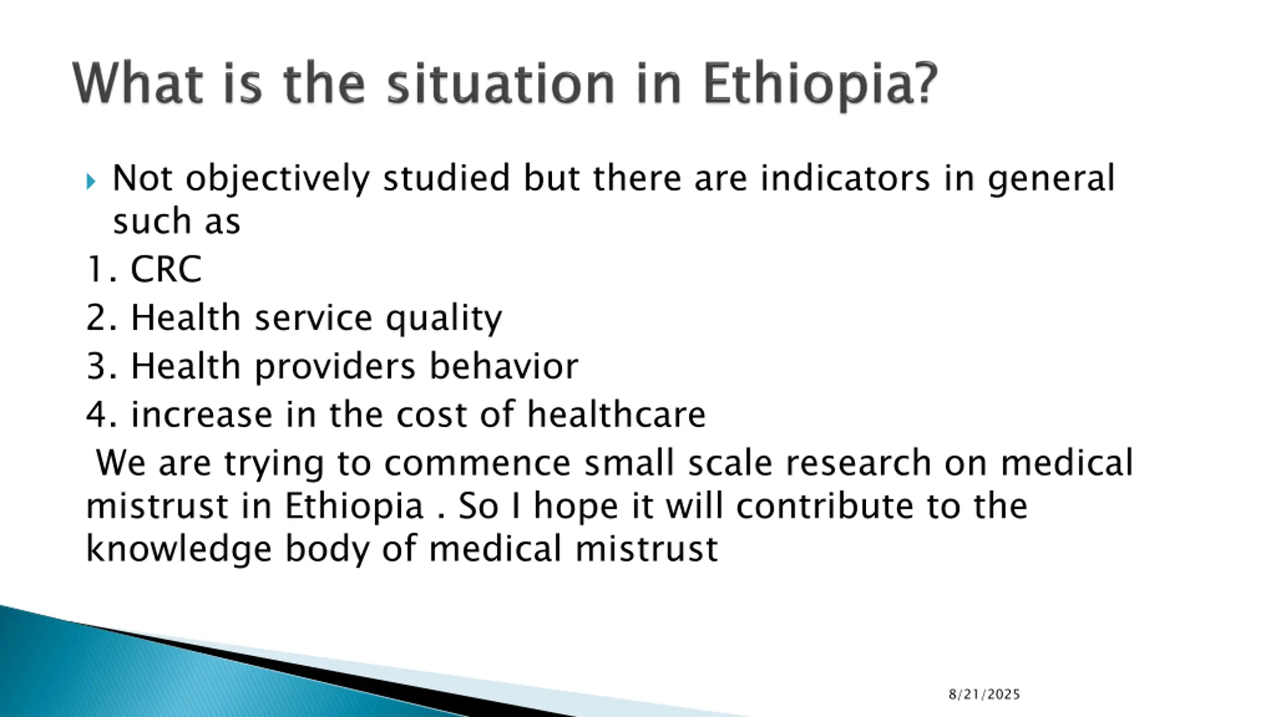 Not objectively studied but there are indicators in general such as 1. CRC 2. Health service quality 3. Health providers behavior 4. increase in the cost of healthcare We are trying to commence small scale research on medical mistrust in Ethiopia . So I hope it will contribute to the knowledge body of medical mistrust 8/21/2025