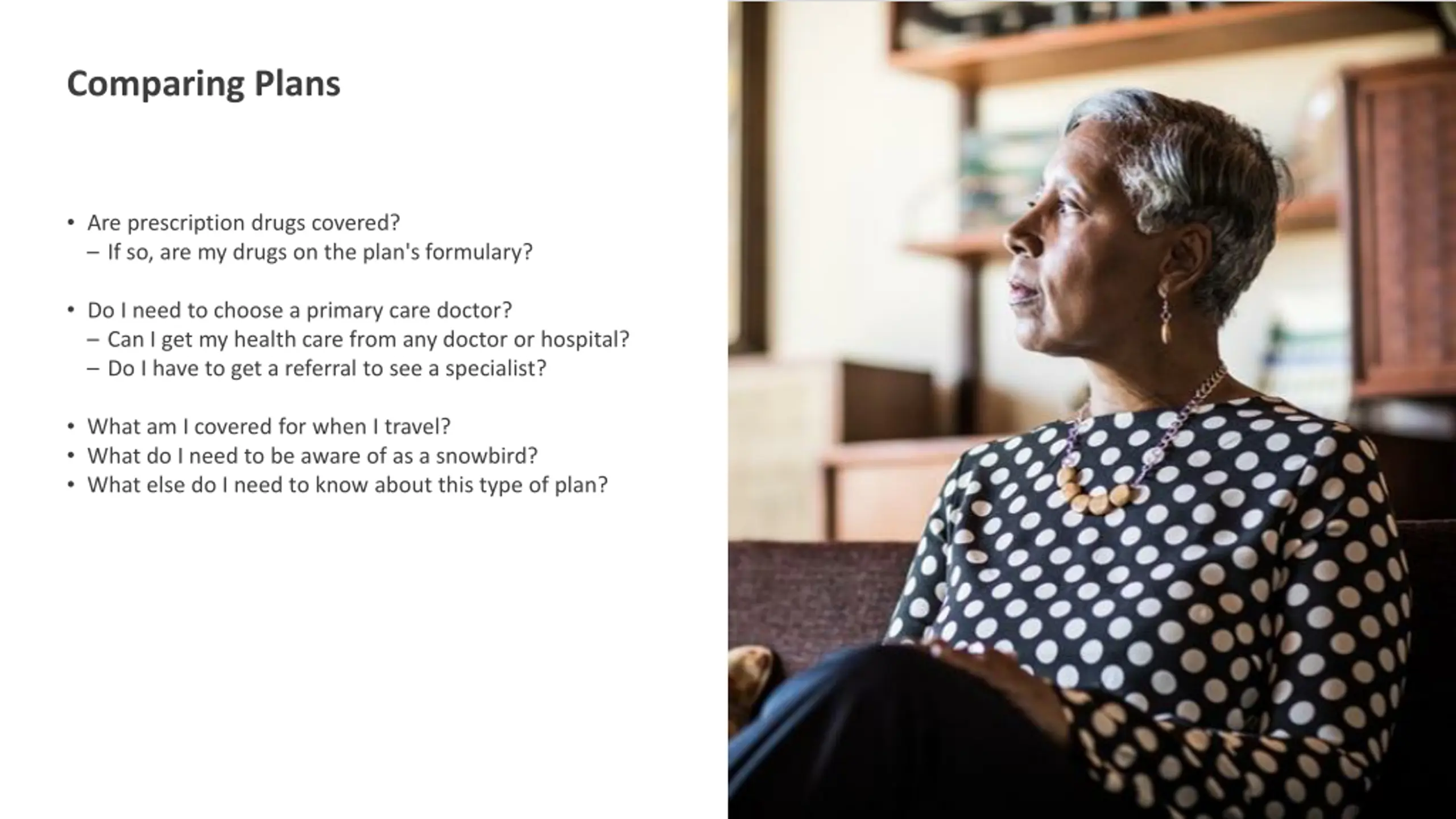 Comparing Plans Are prescription drugs covered? If so, are my drugs on the plan's formulary? Do I need to choose a primary care doctor? Can I get my health care from any doctor or hospital? Do I have to get a referral to see a specialist? What am I covered for when I travel? What do I need to be aware of as a snowbird? What else do I need to know about this type of plan?