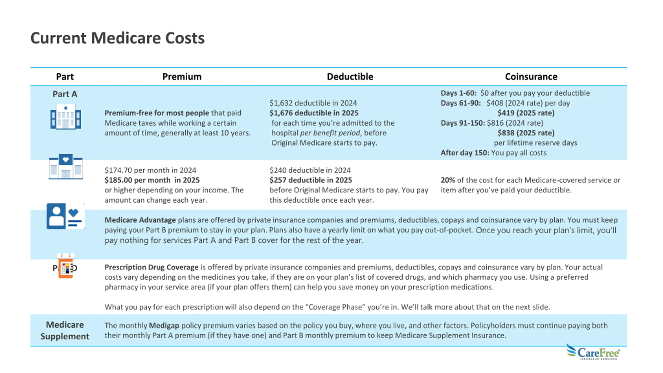 Current Medicare Costs Part Premium Deductible Coinsurance Days 1-60: $0 after you pay your deductible Days 61-90: $408 (2024 rate) per day $419 (2025 rate) Days 91-150: $816 (2024 rate) $838 (2025 rate) per lifetime reserve days After day 150: You pay all costs Part A $1,632 deductible in 2024 $1,676 deductible in 2025 for each time you re admitted to the hospital per benefit period, before Original Medicare starts to pay. Premium-free for most people that paid Medicare taxes while working a certain amount of time, generally at least 10 years. Part B $174.70 per month in 2024 $185.00 per month in 2025 or higher depending on your income. The amount can change each year. $240 deductible in 2024 $257 deductible in 2025 before Original Medicare starts to pay. You pay this deductible once each year. 20% of the cost for each Medicare-covered service or item after you ve paid your deductible. Part C Medicare Advantage plans are offered by private insurance companies and premiums, deductibles, copays and coinsurance vary by plan. You must keep paying your Part B premium to stay in your plan. Plans also have a yearly limit on what you pay out-of-pocket. Once you reach your plan's limit, you'll pay nothing for services Part A and Part B cover for the rest of the year. Prescription Drug Coverage is offered by private insurance companies and premiums, deductibles, copays and coinsurance vary by plan. Your actual costs vary depending on the medicines you take, if they are on your plan s list of covered drugs, and which pharmacy you use. Using a preferred pharmacy in your service area (if your plan offers them) can help you save money on your prescription medications. Part D What you pay for each prescription will also depend on the Coverage Phase you re in. We ll talk more about that on the next slide. Medicare Supplement The monthly Medigap policy premium varies based on the policy you buy, where you live, and other factors. Policyholders must continue paying both their monthly Part A premium (if they have one) and Part B monthly premium to keep Medicare Supplement Insurance.