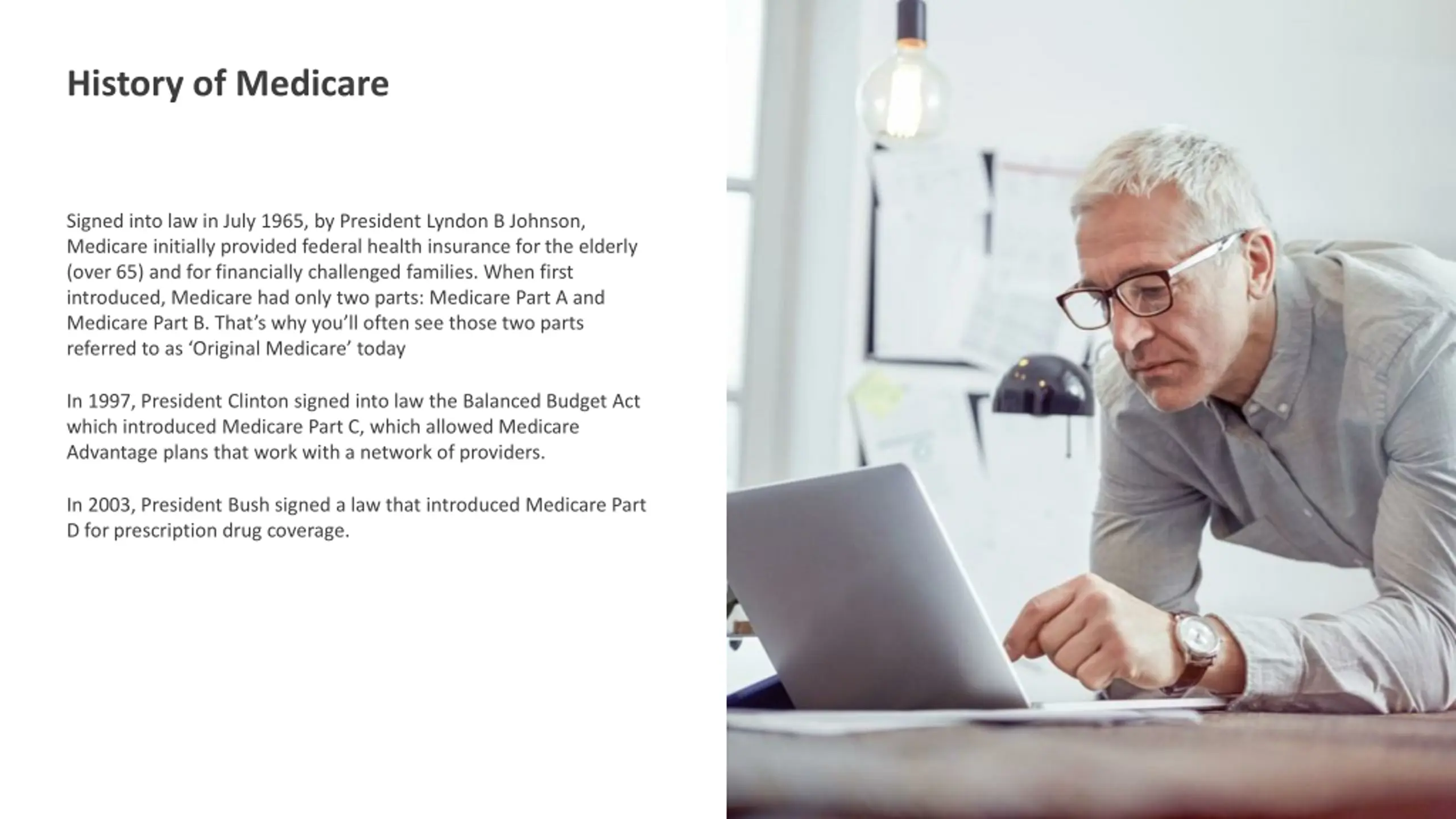 History of Medicare Signed into law in July 1965, by President Lyndon B Johnson, Medicare initially provided federal health insurance for the elderly (over 65) and for financially challenged families. When first introduced, Medicare had only two parts: Medicare Part A and Medicare Part B. That s why you ll often see those two parts referred to as Original Medicare today In 1997, President Clinton signed into law the Balanced Budget Act which introduced Medicare Part C, which allowed Medicare Advantage plans that work with a network of providers. In 2003, President Bush signed a law that introduced Medicare Part D for prescription drug coverage.