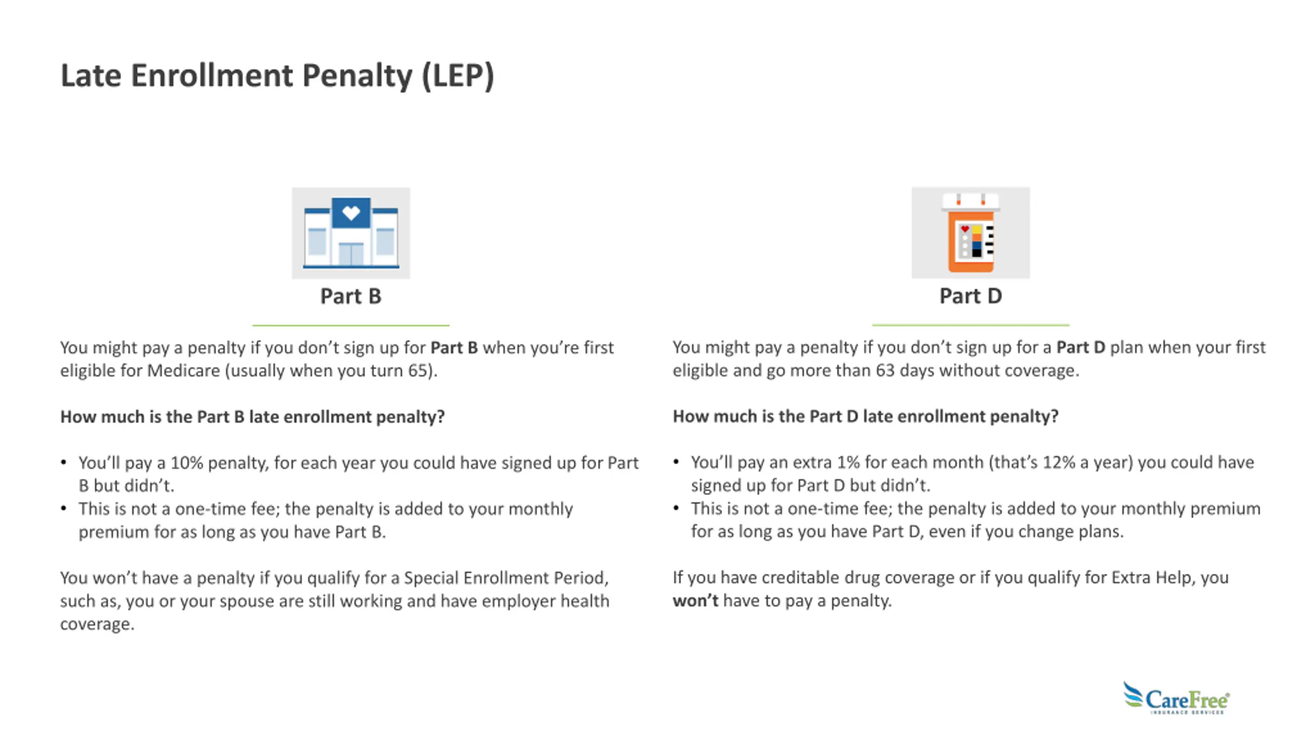 Late Enrollment Penalty (LEP) Part D Part B You might pay a penalty if you don t sign up for a Part D plan when your first eligible and go more than 63 days without coverage. You might pay a penalty if you don t sign up for Part B when you re first eligible for Medicare (usually when you turn 65). How much is the Part D late enrollment penalty? How much is the Part B late enrollment penalty? You ll pay an extra 1% for each month (that s 12% a year) you could have signed up for Part D but didn t. This is not a one-time fee; the penalty is added to your monthly premium for as long as you have Part D, even if you change plans. You ll pay a 10% penalty, for each year you could have signed up for Part B but didn t. This is not a one-time fee; the penalty is added to your monthly premium for as long as you have Part B. If you have creditable drug coverage or if you qualify for Extra Help, you won t have to pay a penalty. You won t have a penalty if you qualify for a Special Enrollment Period, such as, you or your spouse are still working and have employer health coverage.