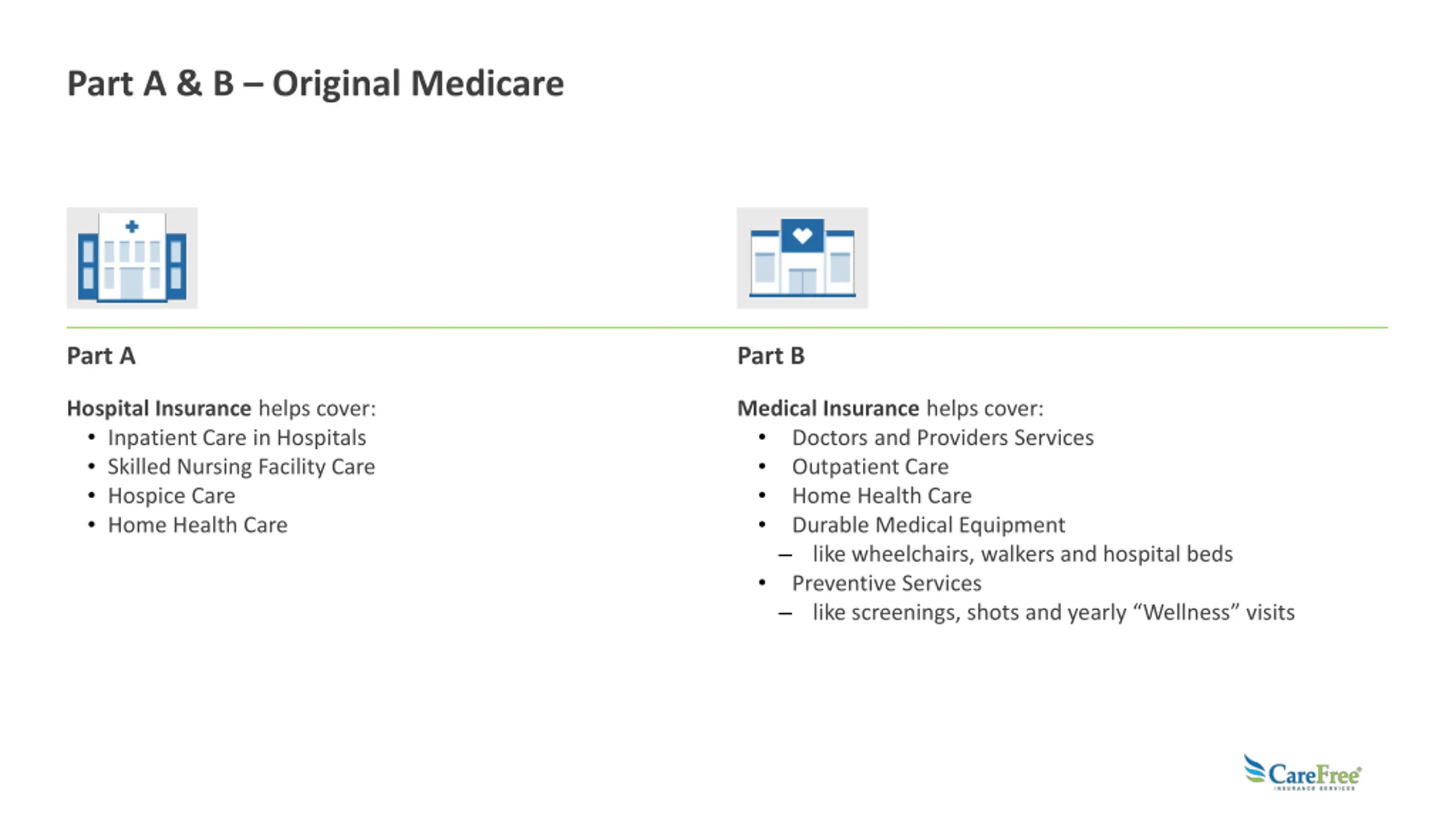 Part A & B Original Medicare Part A Part B Hospital Insurance helps cover: Inpatient Care in Hospitals Skilled Nursing Facility Care Hospice Care Home Health Care Medical Insurance helps cover: Doctors and Providers Services Outpatient Care Home Health Care Durable Medical Equipment like wheelchairs, walkers and hospital beds Preventive Services like screenings, shots and yearly Wellness visits