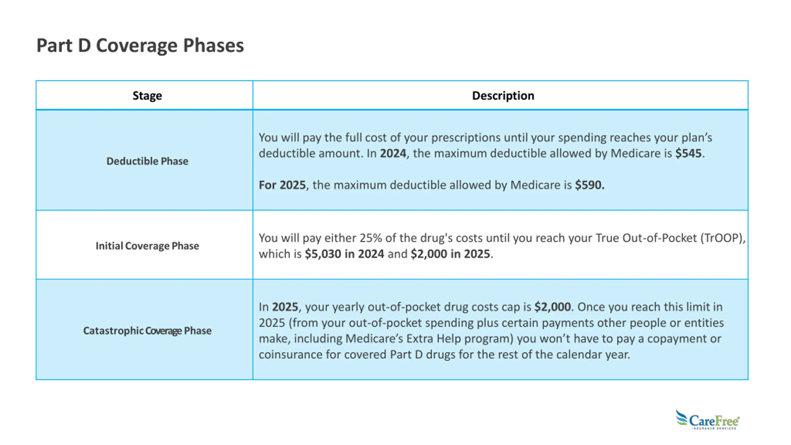 Part D Coverage Phases Stage Description You will pay the full cost of your prescriptions until your spending reaches your plan s deductible amount. In 2024, the maximum deductible allowed by Medicare is $545. Deductible Phase For 2025, the maximum deductible allowed by Medicare is $590. You will pay either 25% of the drug's costs until you reach your True Out-of-Pocket (TrOOP), which is $5,030 in 2024 and $2,000 in 2025. InitialCoveragePhase In 2025, your yearly out-of-pocket drug costs cap is $2,000. Once you reach this limit in 2025 (from your out-of-pocket spending plus certain payments other people or entities make, including Medicare s Extra Help program) you won t have to pay a copayment or coinsurance for covered Part D drugs for the rest of the calendar year. CatastrophicCoverage Phase