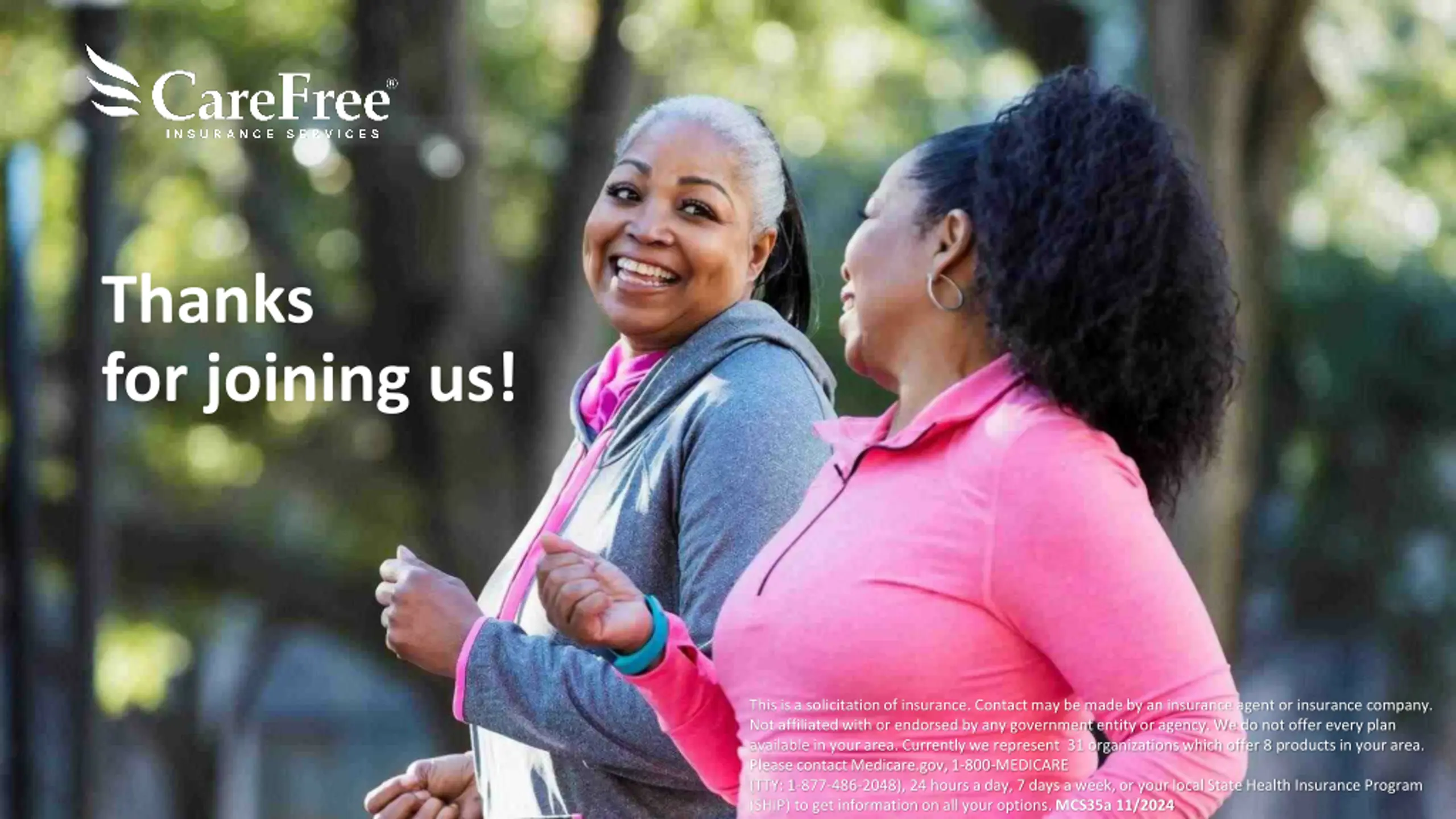 Thanks for joining us! This is a solicitation of insurance. Contact may be made by an insurance agent or insurance company. Not affiliated with or endorsed by any government entity or agency. We do not offer every plan available in your area. Currently we represent 31 organizations which offer 8 products in your area. Please contact Medicare.gov, 1-800-MEDICARE (TTY: 1-877-486-2048), 24 hours a day, 7 days a week, or your local State Health Insurance Program (SHIP) to get information on all your options. MCS35a 11/2024