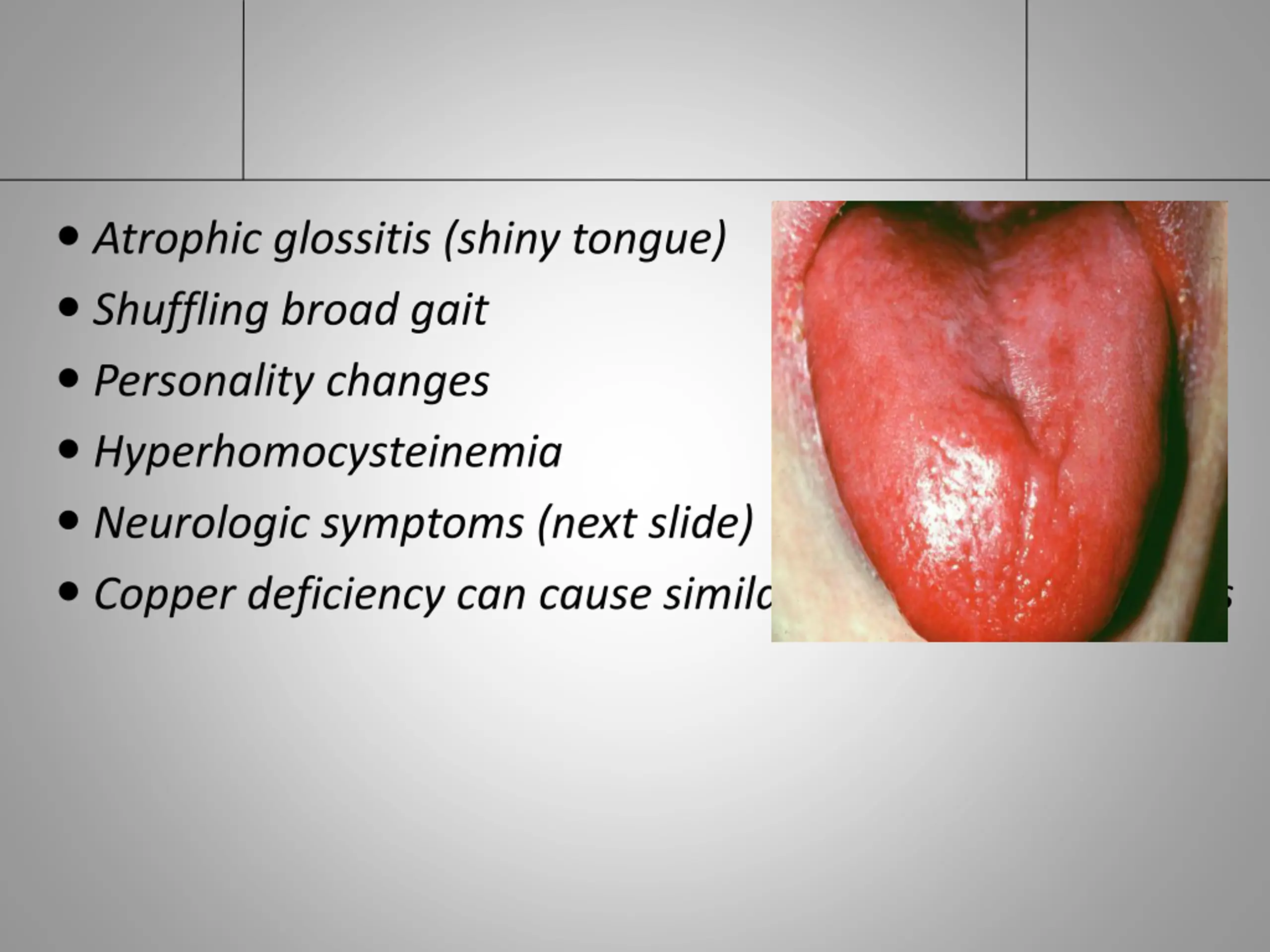 Atrophic glossitis (shiny tongue) Shuffling broad gait Personality changes Hyperhomocysteinemia Neurologic symptoms (next slide) Copper deficiency can cause similar neurologic symptoms