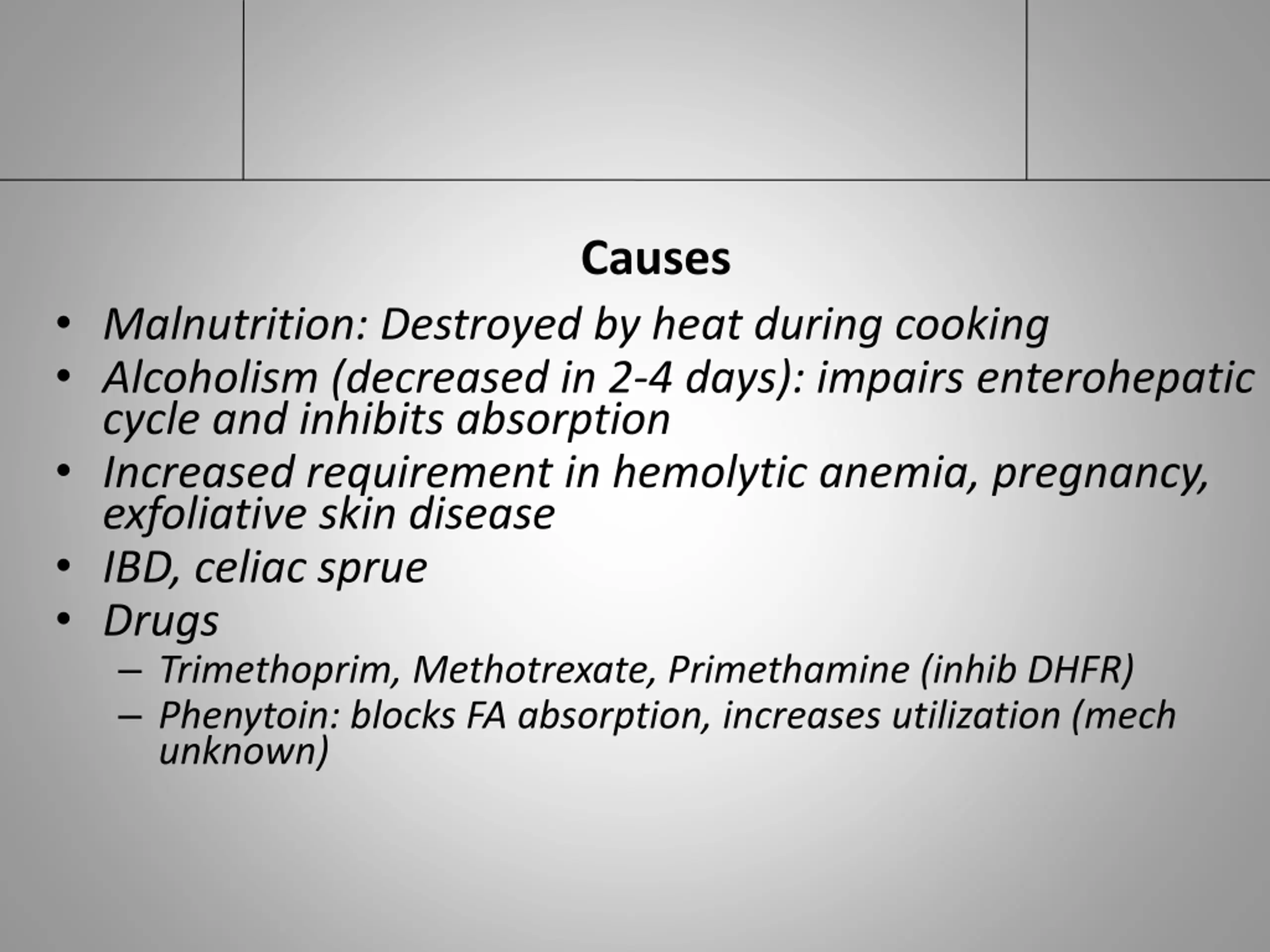 Causes Malnutrition: Destroyed by heat during cooking Alcoholism (decreased in 2-4 days): impairs enterohepatic cycle and inhibits absorption Increased requirement in hemolytic anemia, pregnancy, exfoliative skin disease IBD, celiac sprue Drugs Trimethoprim, Methotrexate, Primethamine (inhib DHFR) Phenytoin: blocks FA absorption, increases utilization (mech unknown)