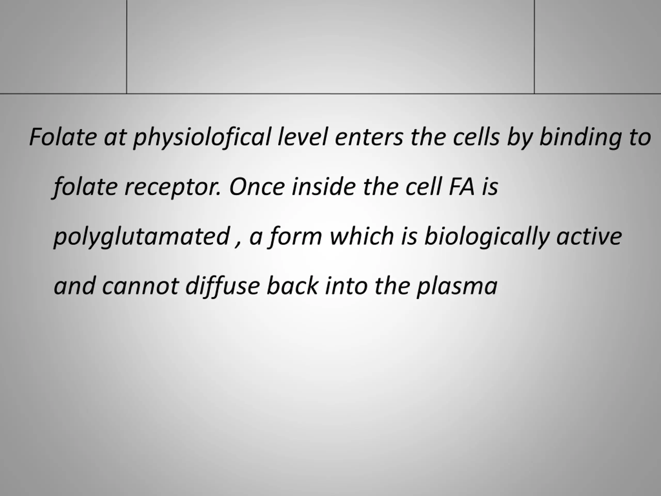 Folate at physiolofical level enters the cells by binding to folate receptor. Once inside the cell FA is polyglutamated , a form which is biologically active and cannot diffuse back into the plasma