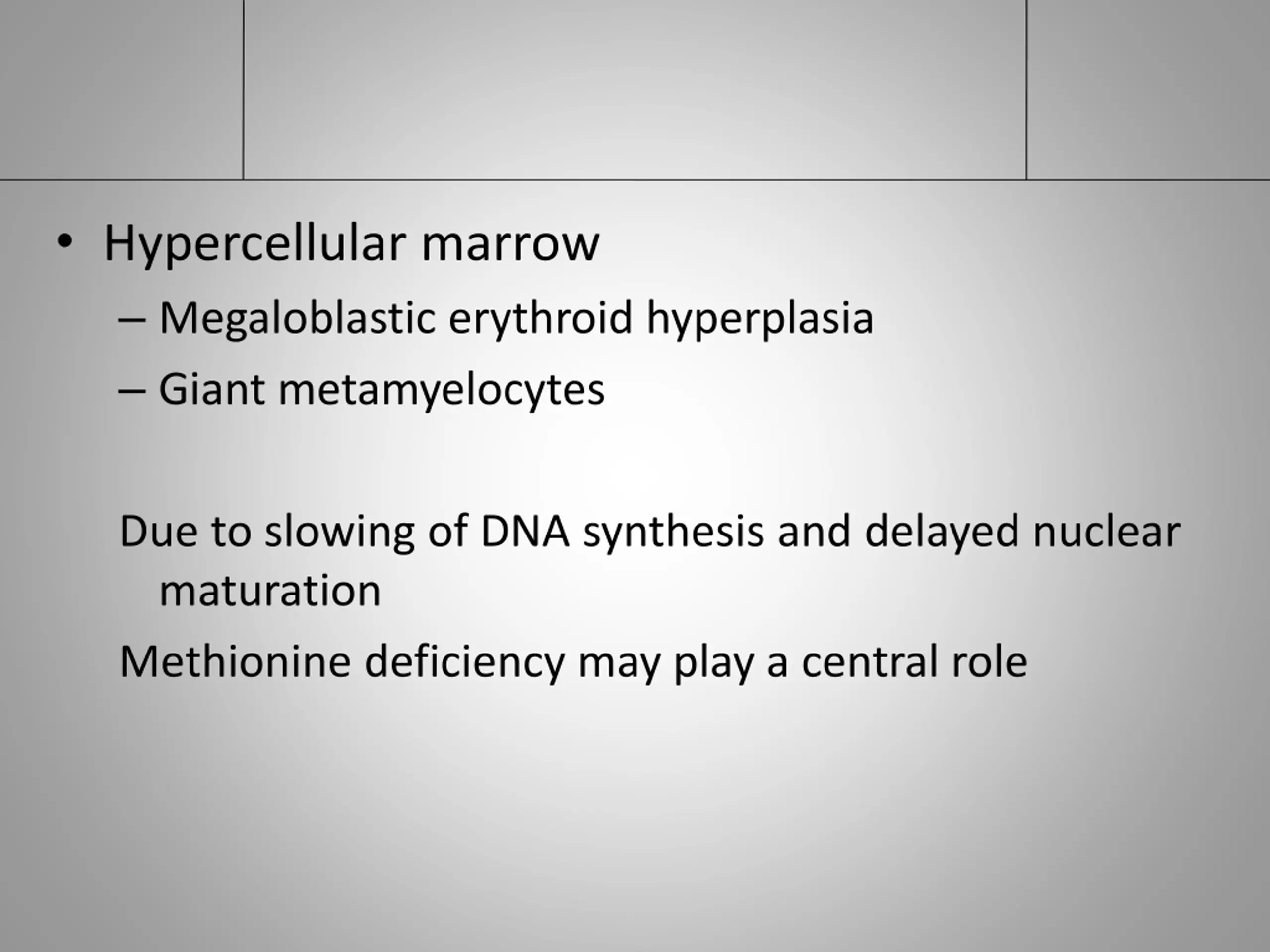 Hypercellular marrow Megaloblastic erythroid hyperplasia Giant metamyelocytes Due to slowing of DNA synthesis and delayed nuclear maturation Methionine deficiency may play a central role