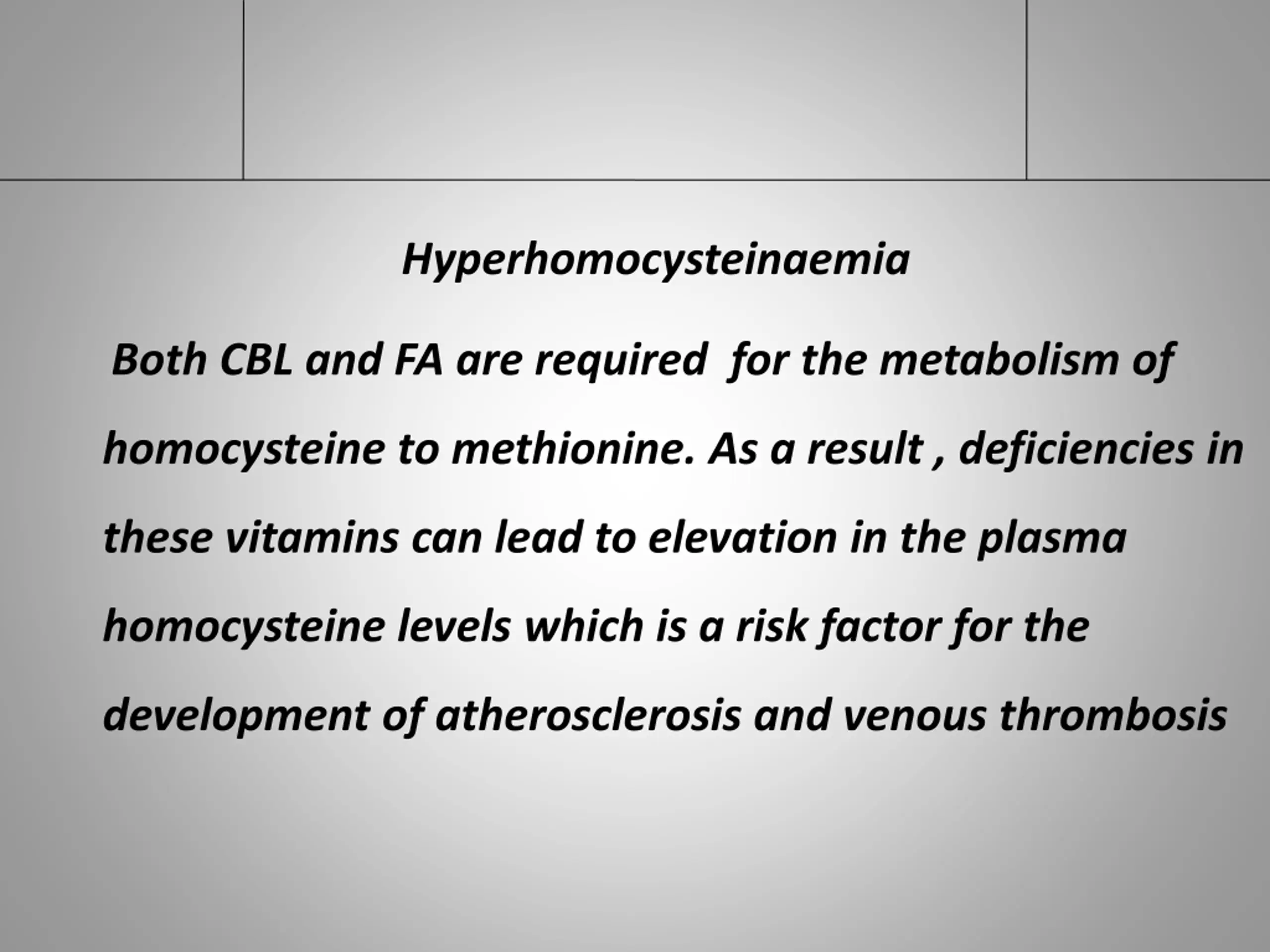 Hyperhomocysteinaemia Both CBL and FA are required for the metabolism of homocysteine to methionine. As a result , deficiencies in these vitamins can lead to elevation in the plasma homocysteine levels which is a risk factor for the development of atherosclerosis and venous thrombosis