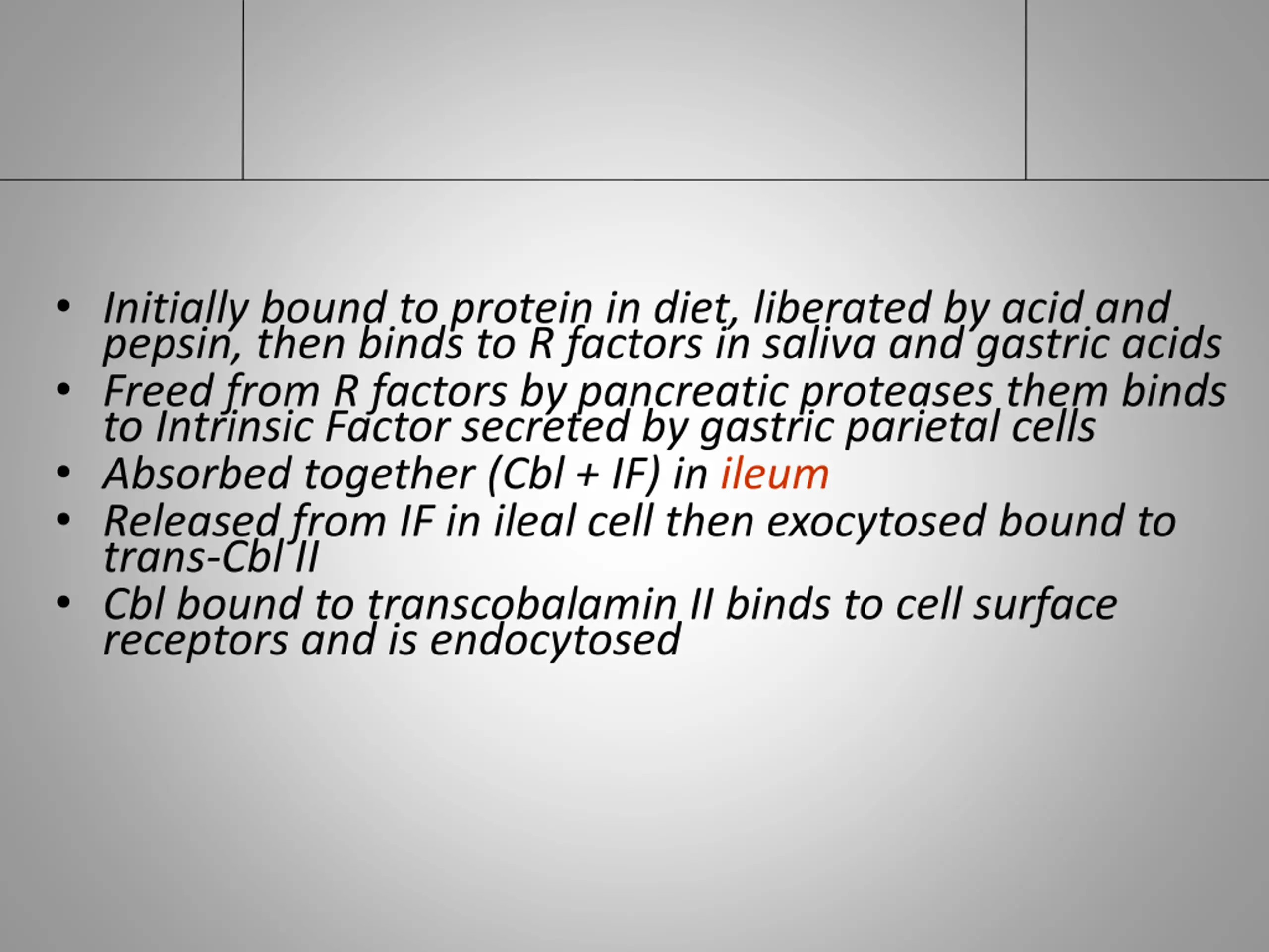 Initially bound to protein in diet, liberated by acid and pepsin, then binds to R factors in saliva and gastric acids Freed from R factors by pancreatic proteases them binds to Intrinsic Factor secreted by gastric parietal cells Absorbed together (Cbl + IF) in ileum Released from IF in ileal cell then exocytosed bound to trans-Cbl II Cbl bound to transcobalamin II binds to cell surface receptors and is endocytosed