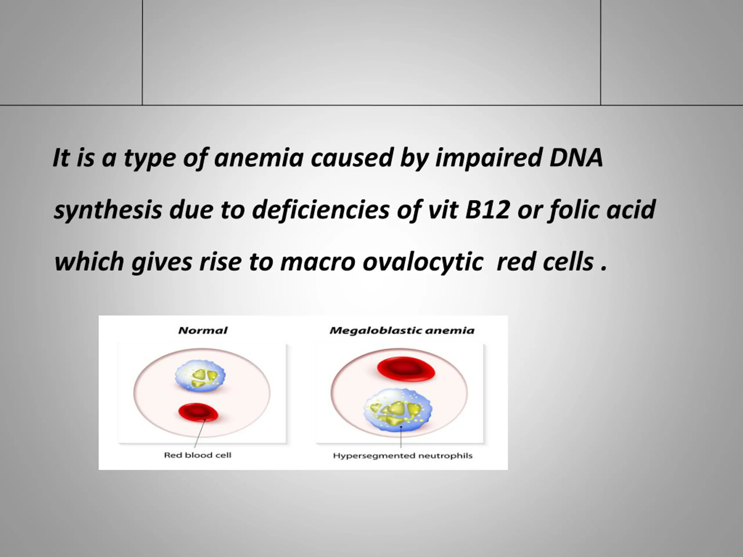 It is a type of anemia caused by impaired DNA synthesis due to deficiencies of vit B12 or folic acid which gives rise to macro ovalocytic red cells .