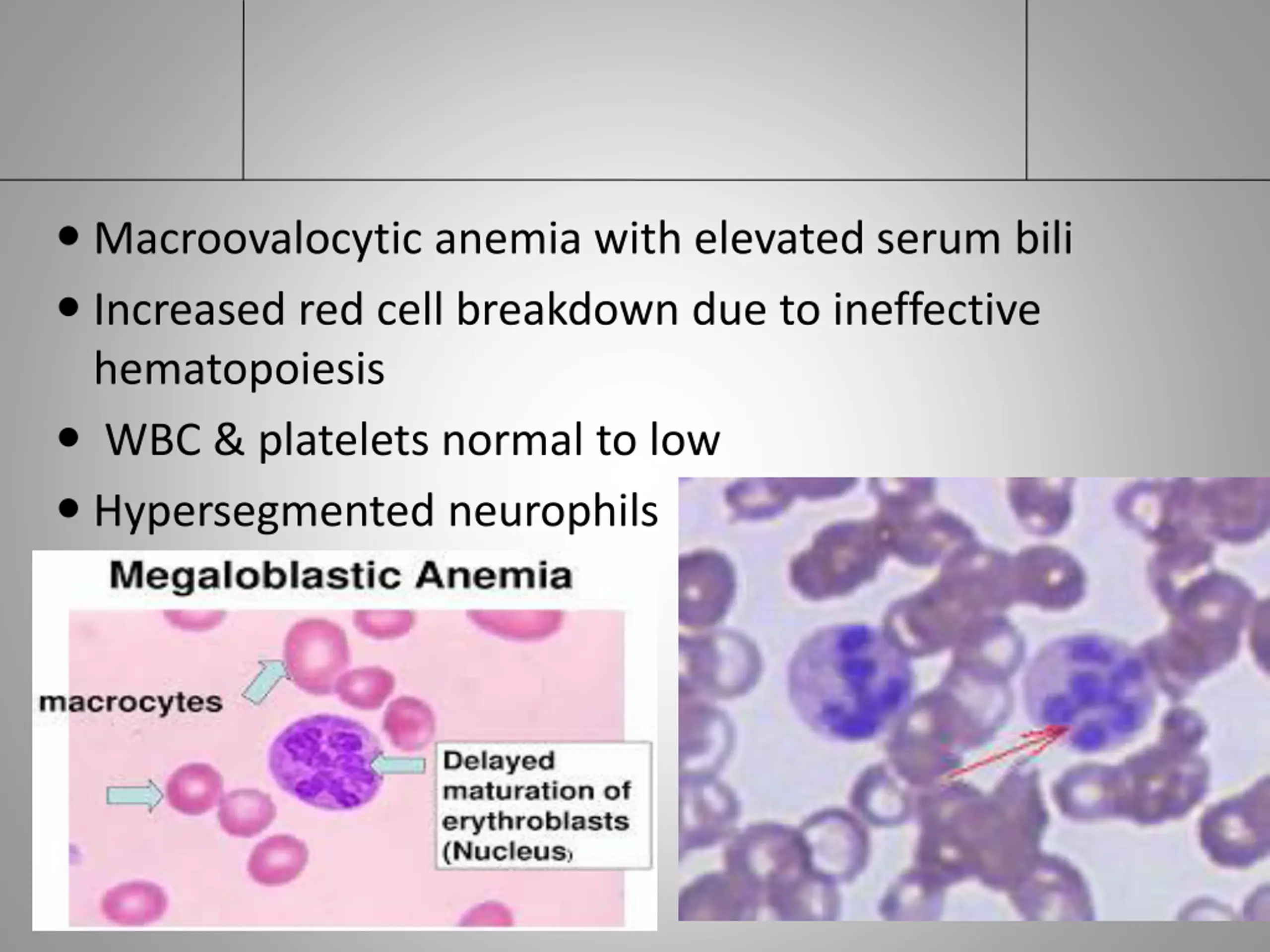 Macroovalocytic anemia with elevated serum bili Increased red cell breakdown due to ineffective hematopoiesis WBC & platelets normal to low Hypersegmented neurophils