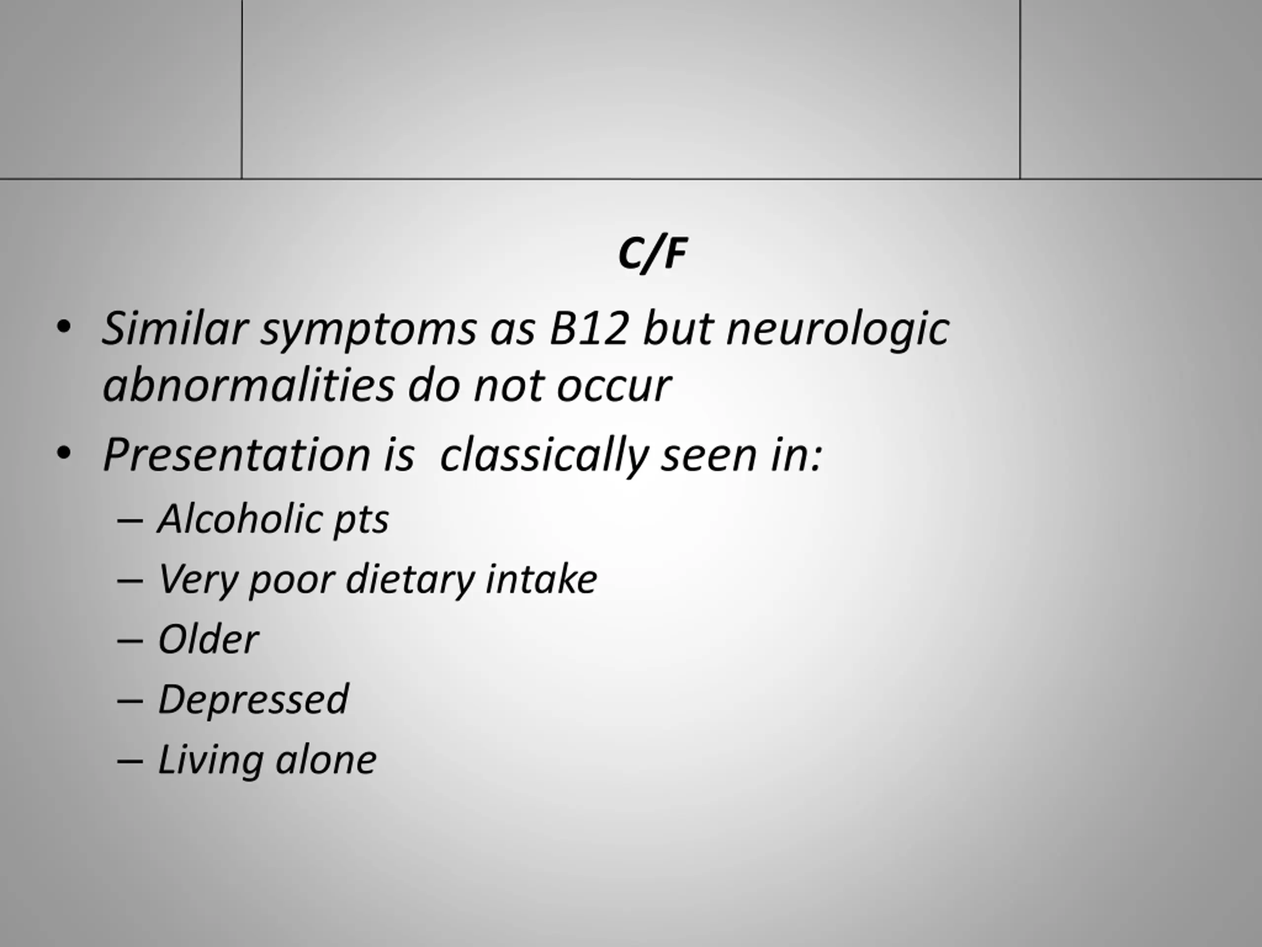 C/F Similar symptoms as B12 but neurologic abnormalities do not occur Presentation is classically seen in: Alcoholic pts Very poor dietary intake Older Depressed Living alone