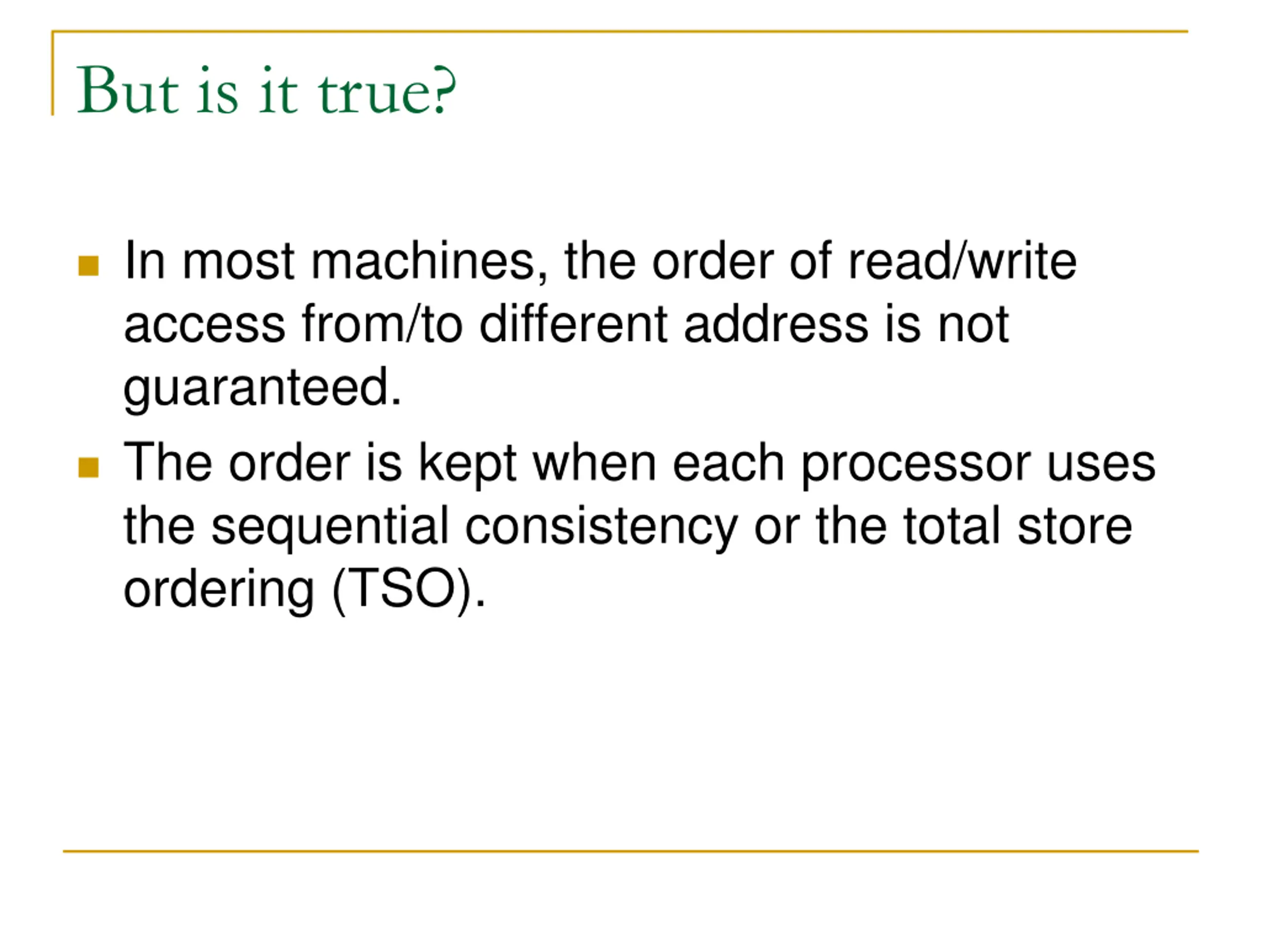 But is it true? In most machines, the order of read/write access from/to different address is not guaranteed. The order is kept when each processor uses the sequential consistency or the total store ordering (TSO).