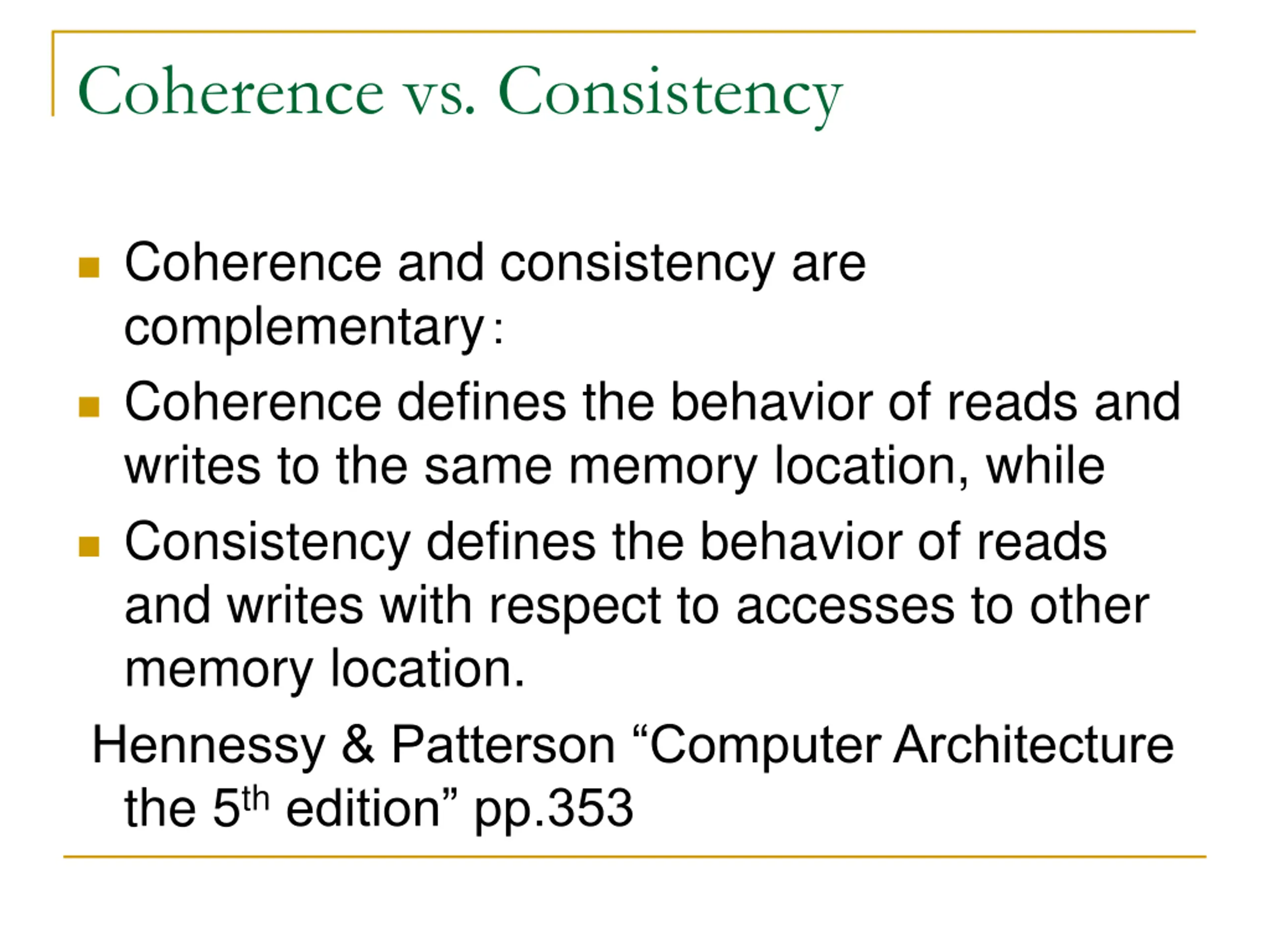 Coherence vs. Consistency Coherence and consistency are complementary Coherence defines the behavior of reads and writes to the same memory location, while Consistency defines the behavior of reads and writes with respect to accesses to other memory location. Hennessy & Patterson Computer Architecture the 5thedition pp.353