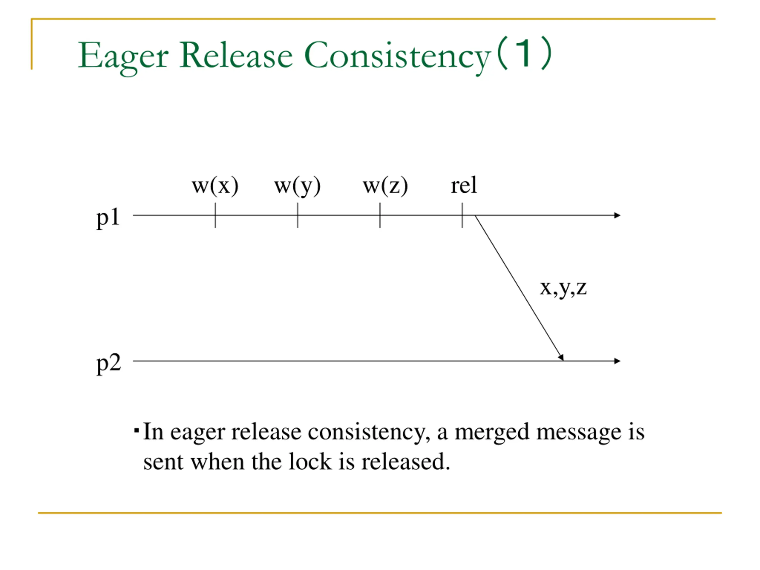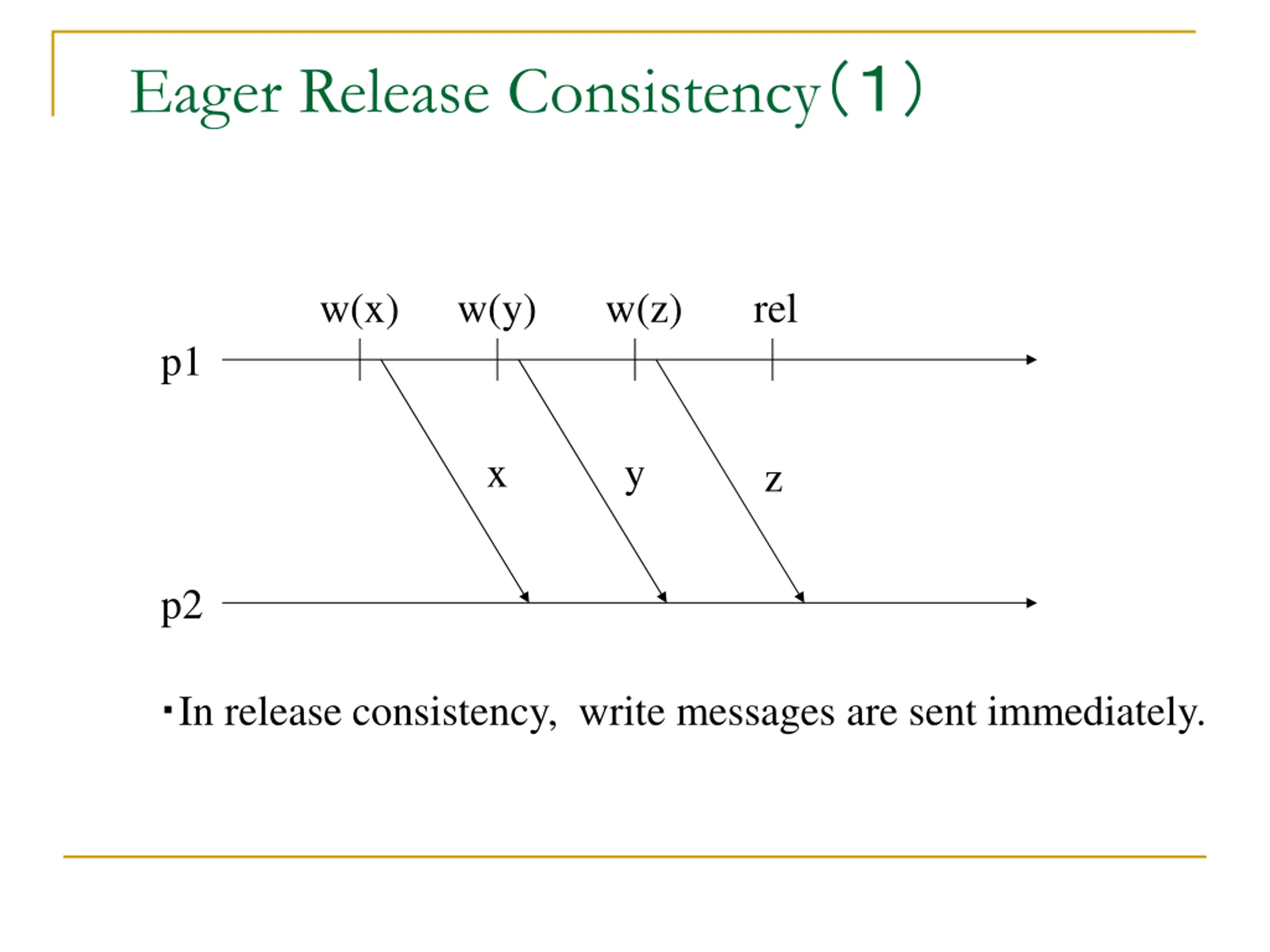 Eager Release Consistency w(x) w(y) w(z) rel p1 x y z p2 In release consistency, write messages are sent immediately.