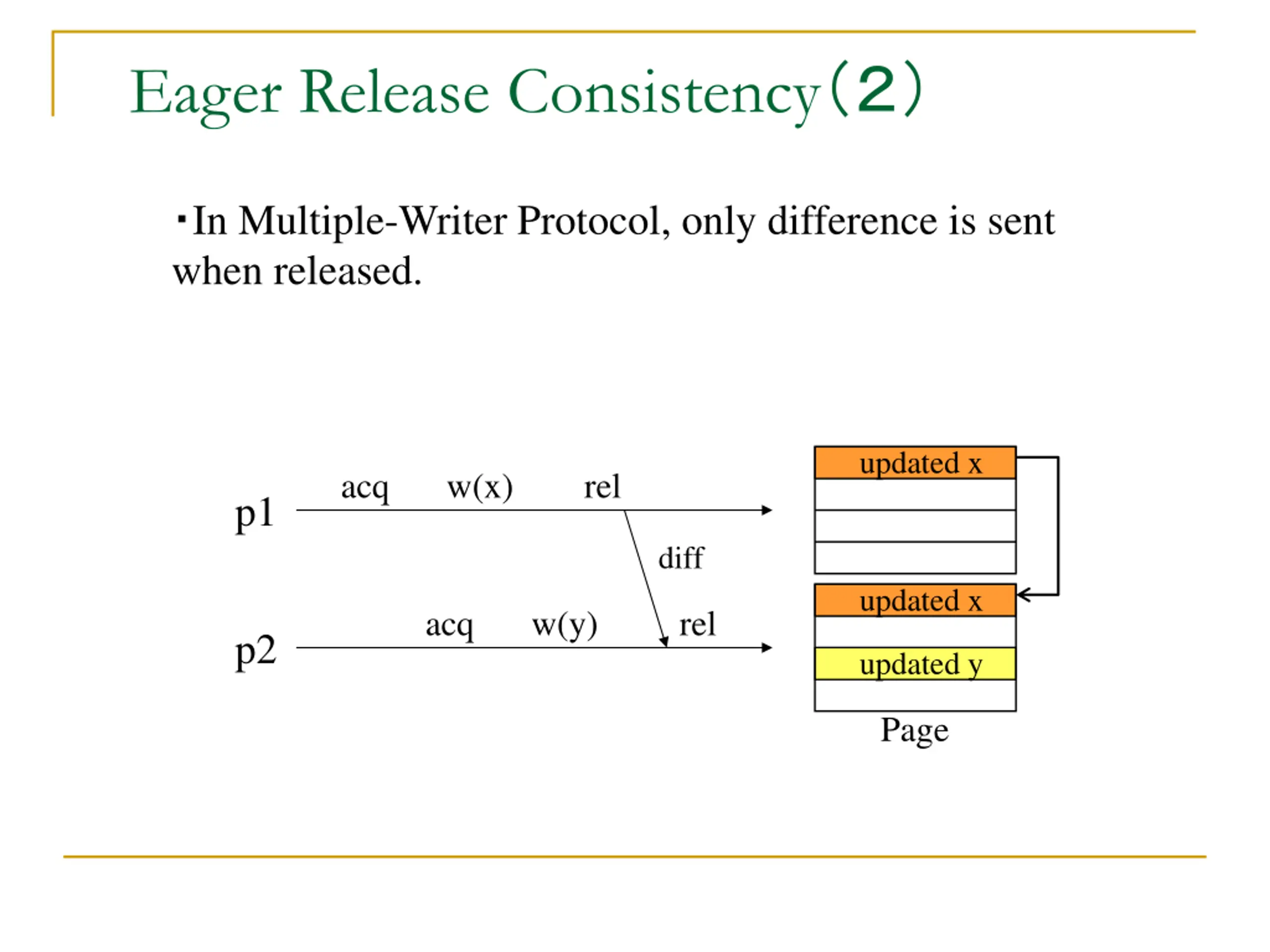 Eager Release Consistency In Multiple-Writer Protocol, only difference is sent when released. updated x acq w(x) rel p1 diff updated x acq w(y) rel p2 updated y Page