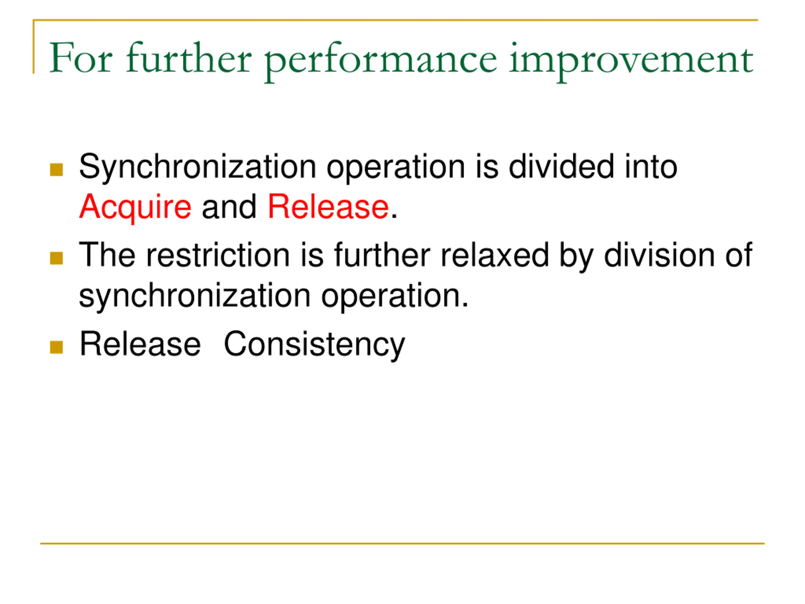For further performance improvement Synchronization operation is divided into Acquire and Release. The restriction is further relaxed by division of synchronization operation. Release Consistency