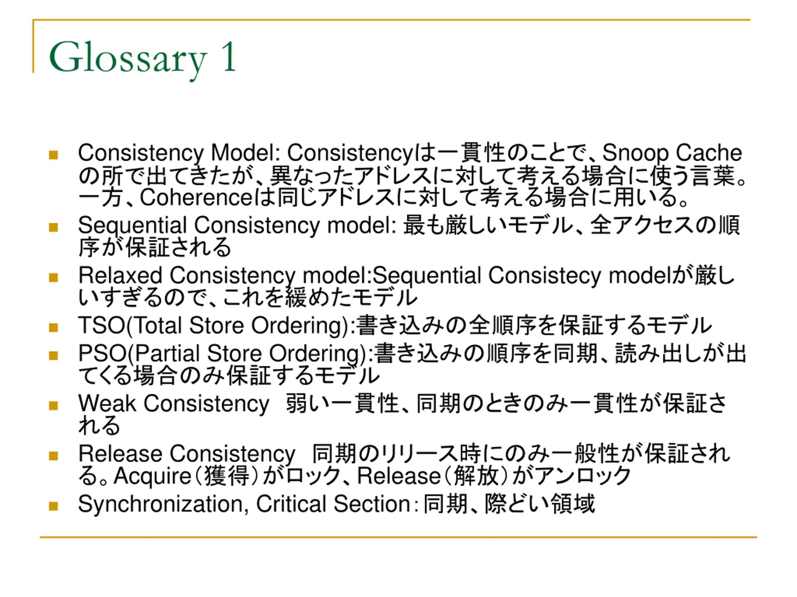 Glossary 1 Consistency Model: Consistency Snoop Cache Coherence Sequential Consistency model: Relaxed Consistency model:Sequential Consistecy model TSO(Total Store Ordering): PSO(Partial Store Ordering): Weak Consistency Release Consistency Acquire Release Synchronization, Critical Section