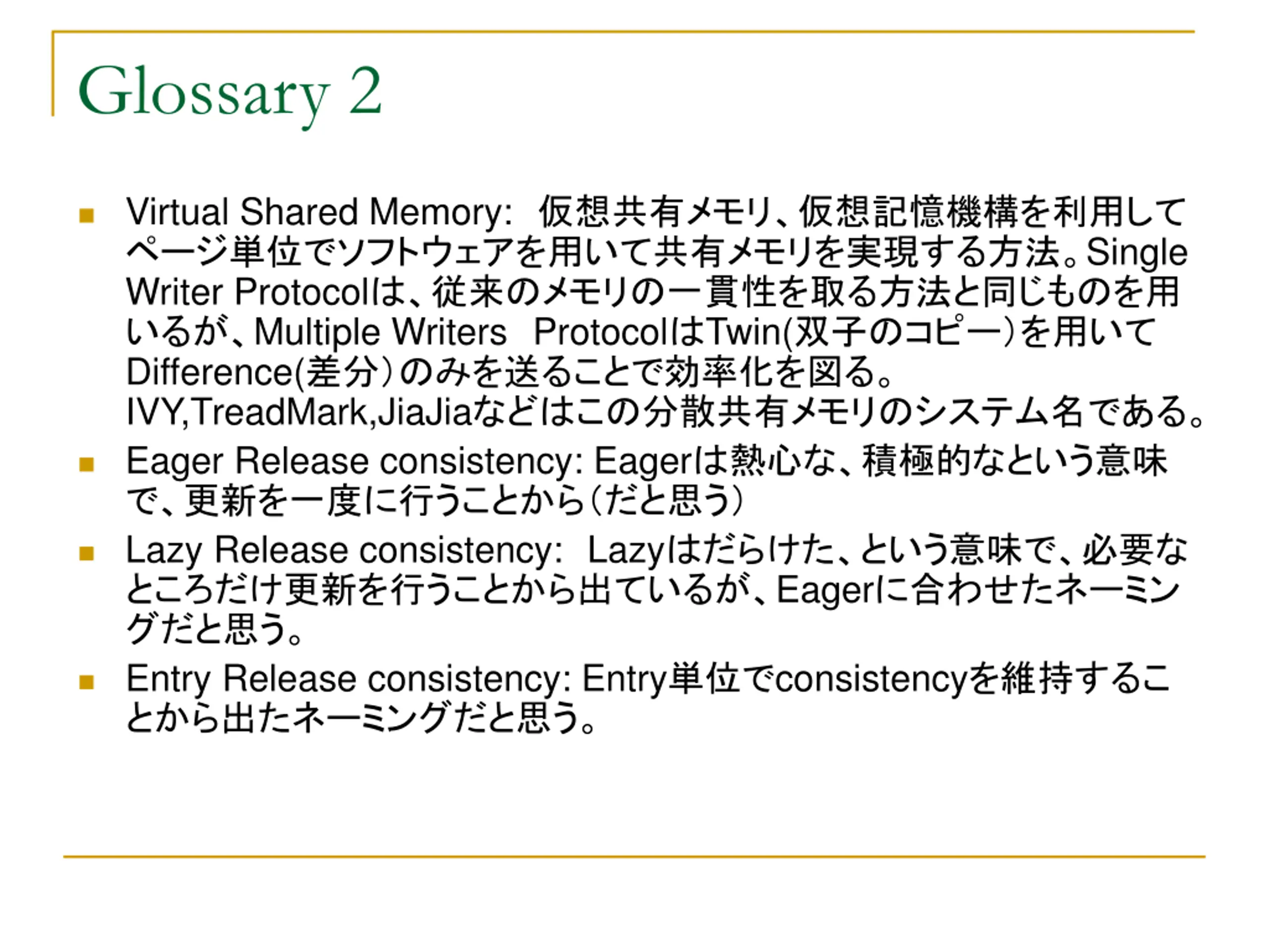 Glossary 2 Virtual Shared Memory: Single Writer Protocol Multiple Writers Protocol Twin( Difference( IVY,TreadMark,JiaJia Eager Release consistency: Eager Lazy Release consistency: Lazy Eager Entry Release consistency: Entry consistency