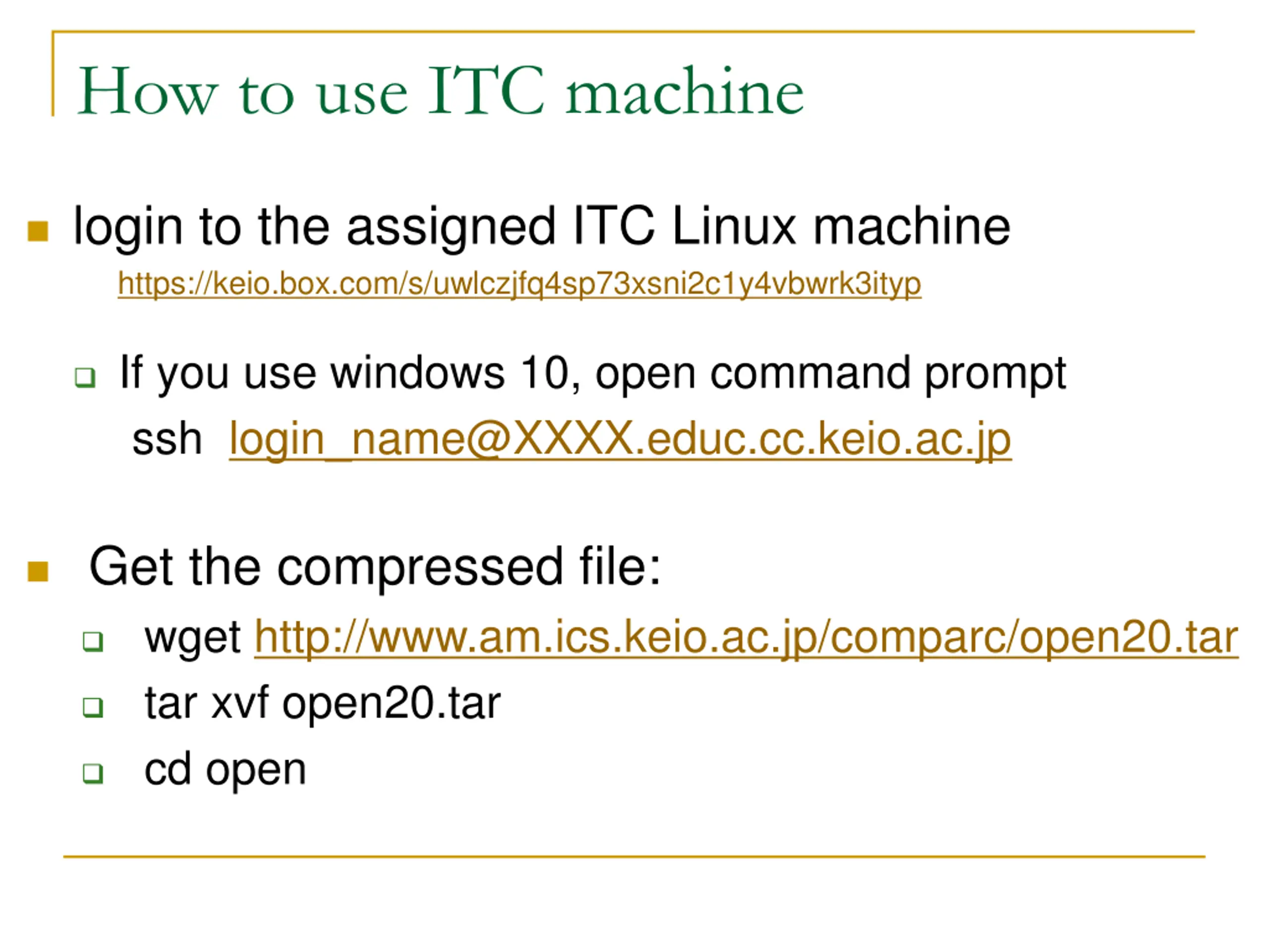 How to use ITC machine login to the assigned ITC Linux machine https://keio.box.com/s/uwlczjfq4sp73xsni2c1y4vbwrk3ityp If you use windows 10, open command prompt ssh login_name@XXXX.educ.cc.keio.ac.jp Get the compressed file: wget http://www.am.ics.keio.ac.jp/comparc/open20.tar tar xvf open20.tar cd open