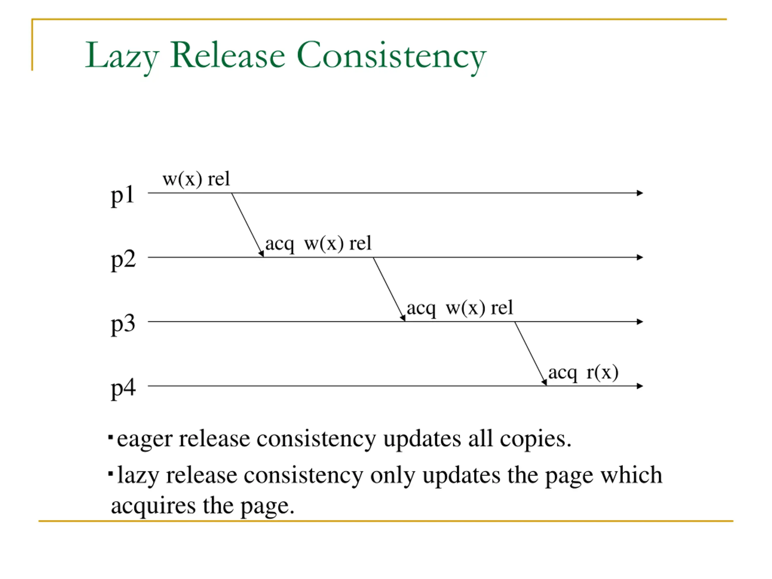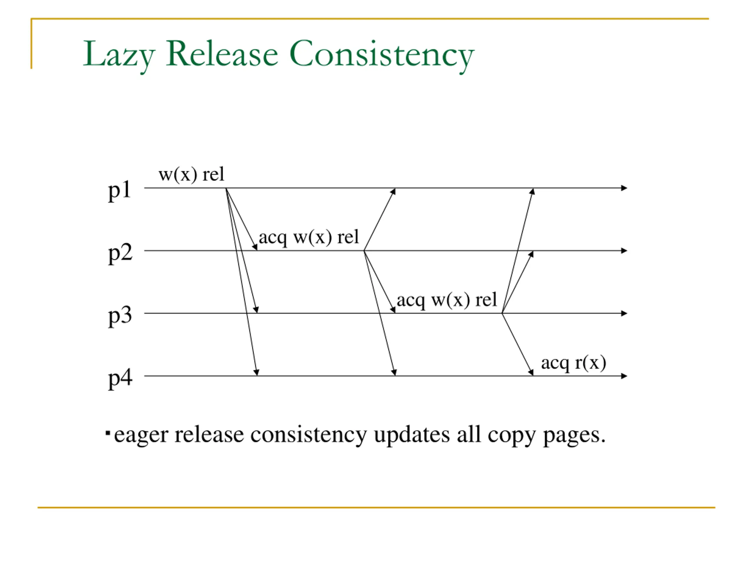 Lazy Release Consistency w(x) rel p1 acq w(x) rel p2 acq w(x) rel p3 acq r(x) p4 eager release consistency updates all copies. lazy release consistency only updates the page which acquires the page.
