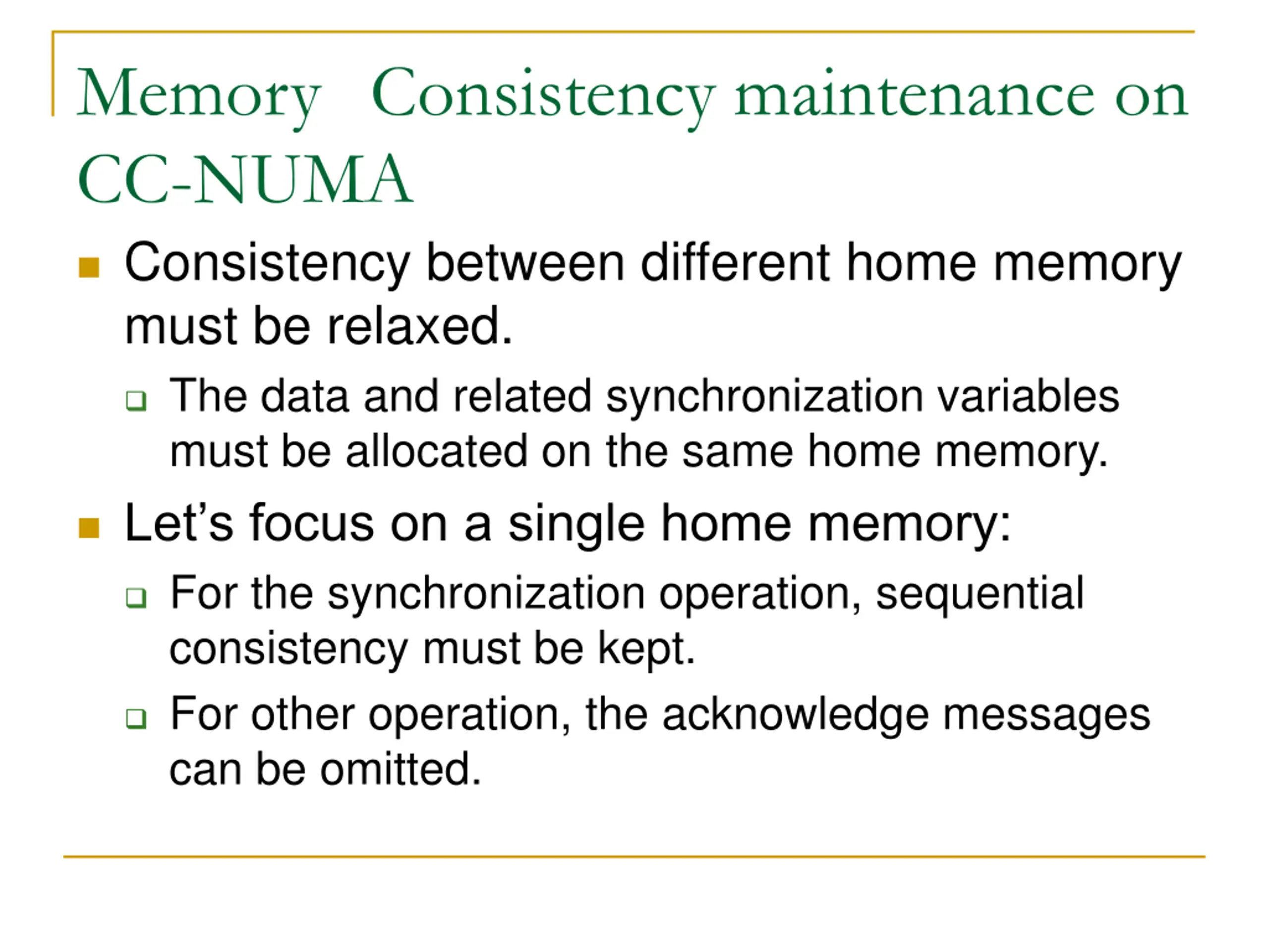 Memory Consistency maintenance on CC-NUMA Consistency between different home memory must be relaxed. The data and related synchronization variables must be allocated on the same home memory. Let s focus on a single home memory: For the synchronization operation, sequential consistency must be kept. For other operation, the acknowledge messages can be omitted.