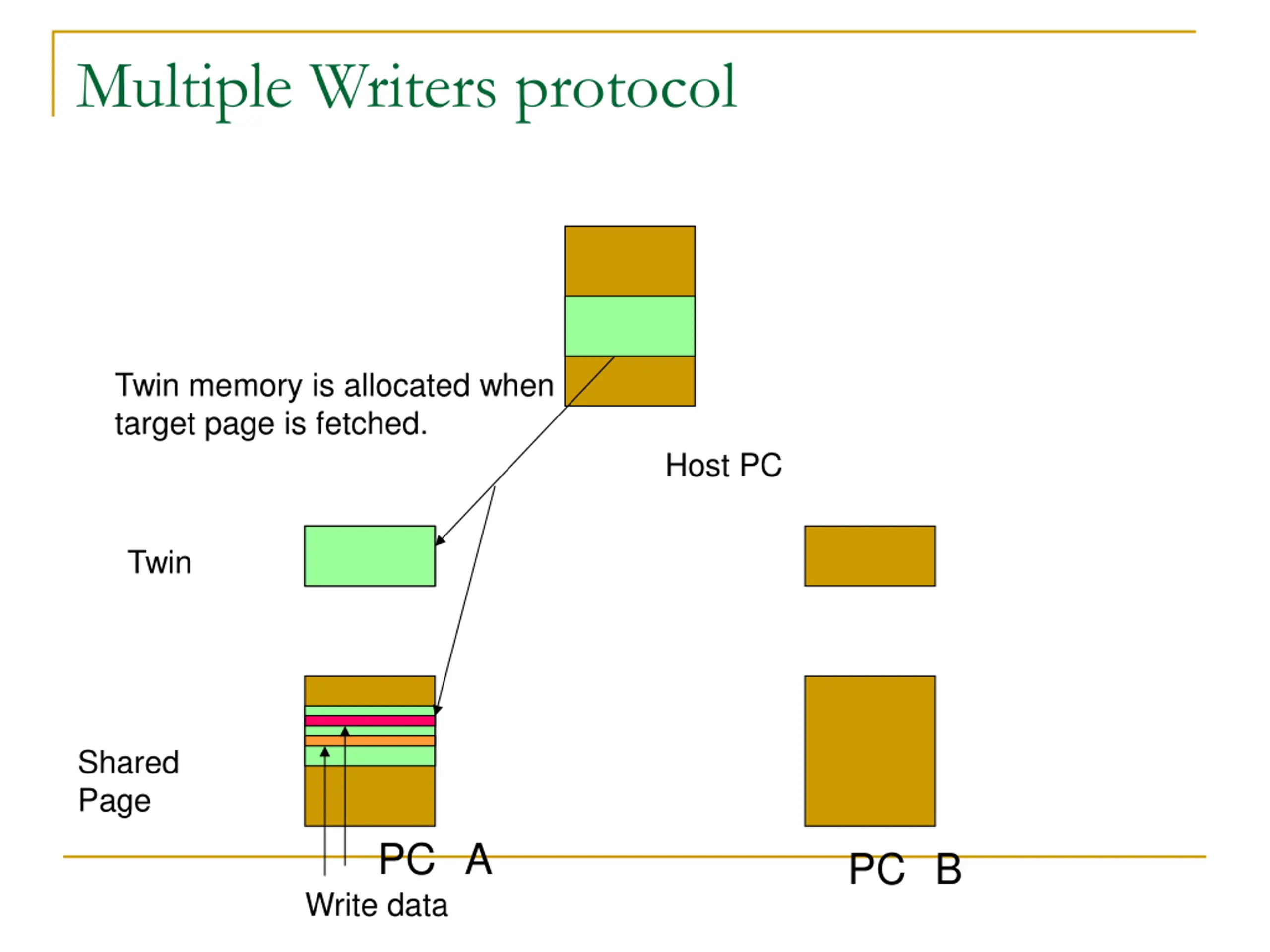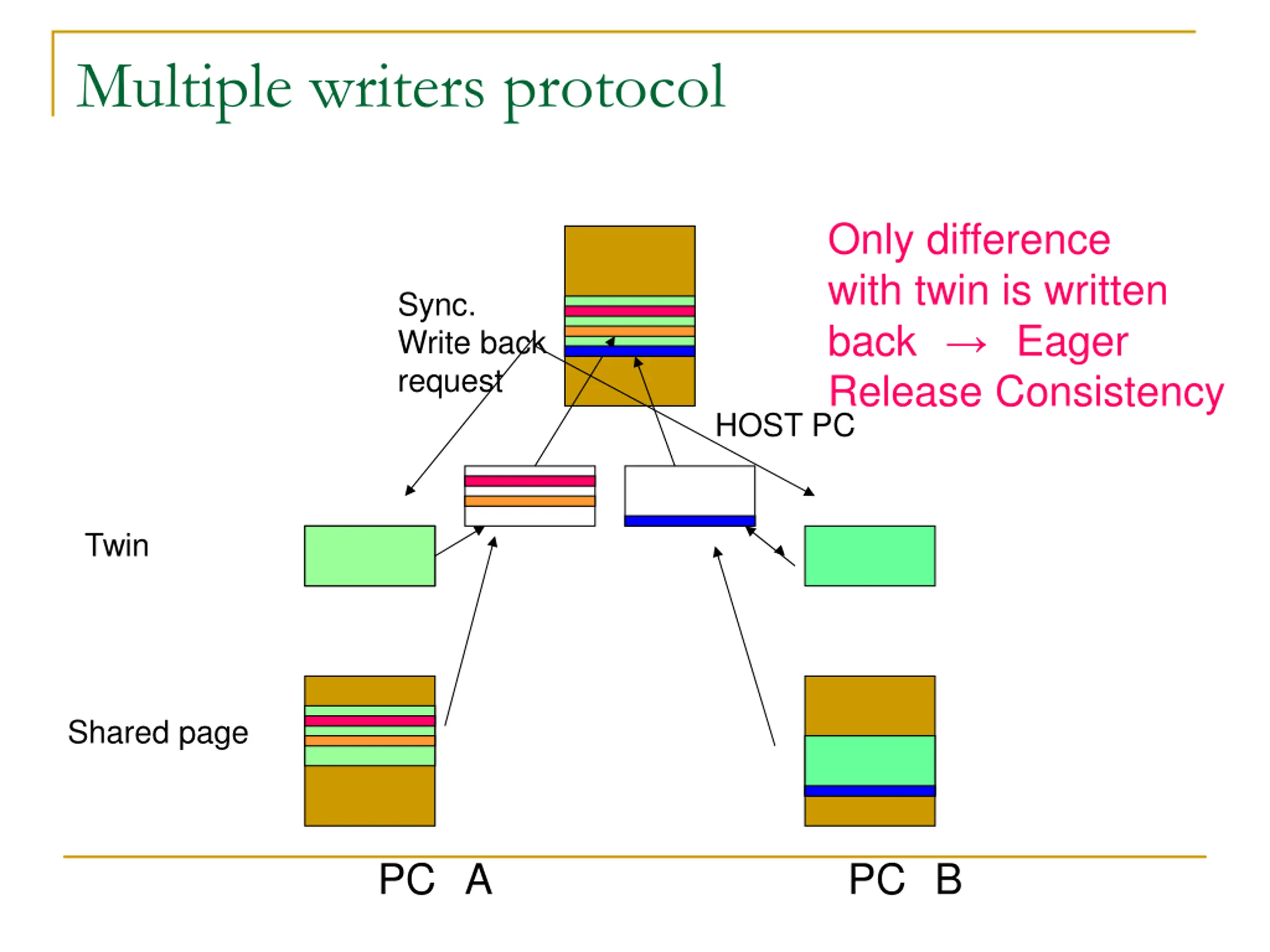 Multiple writers protocol Only difference with twin is written back Eager Release Consistency HOST PC Sync. Write back request Twin Shared page PC A PC B