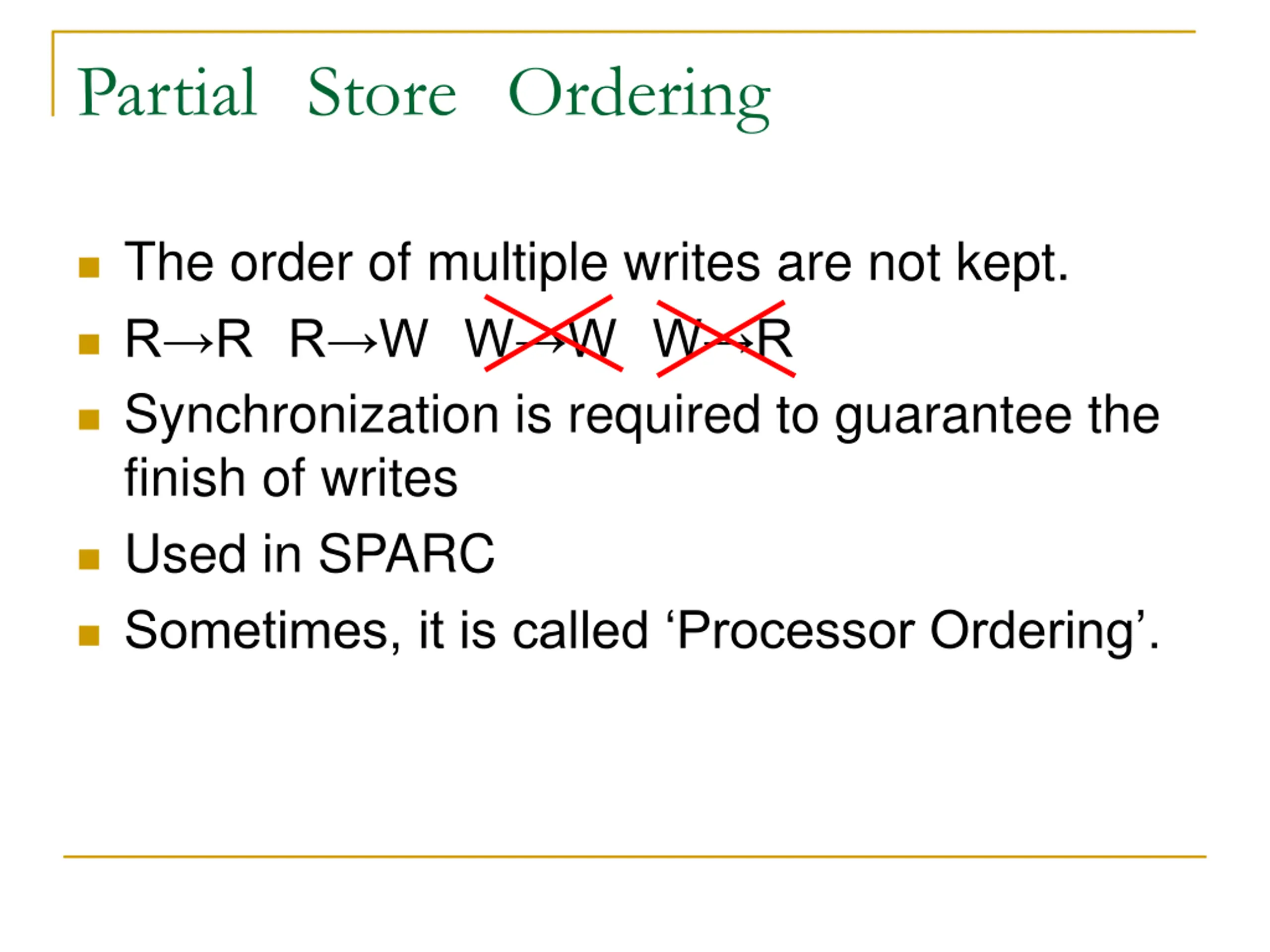 Partial Store Ordering The order of multiple writes are not kept. R R R W W W W R Synchronization is required to guarantee the finish of writes Used in SPARC Sometimes, it is called Processor Ordering .