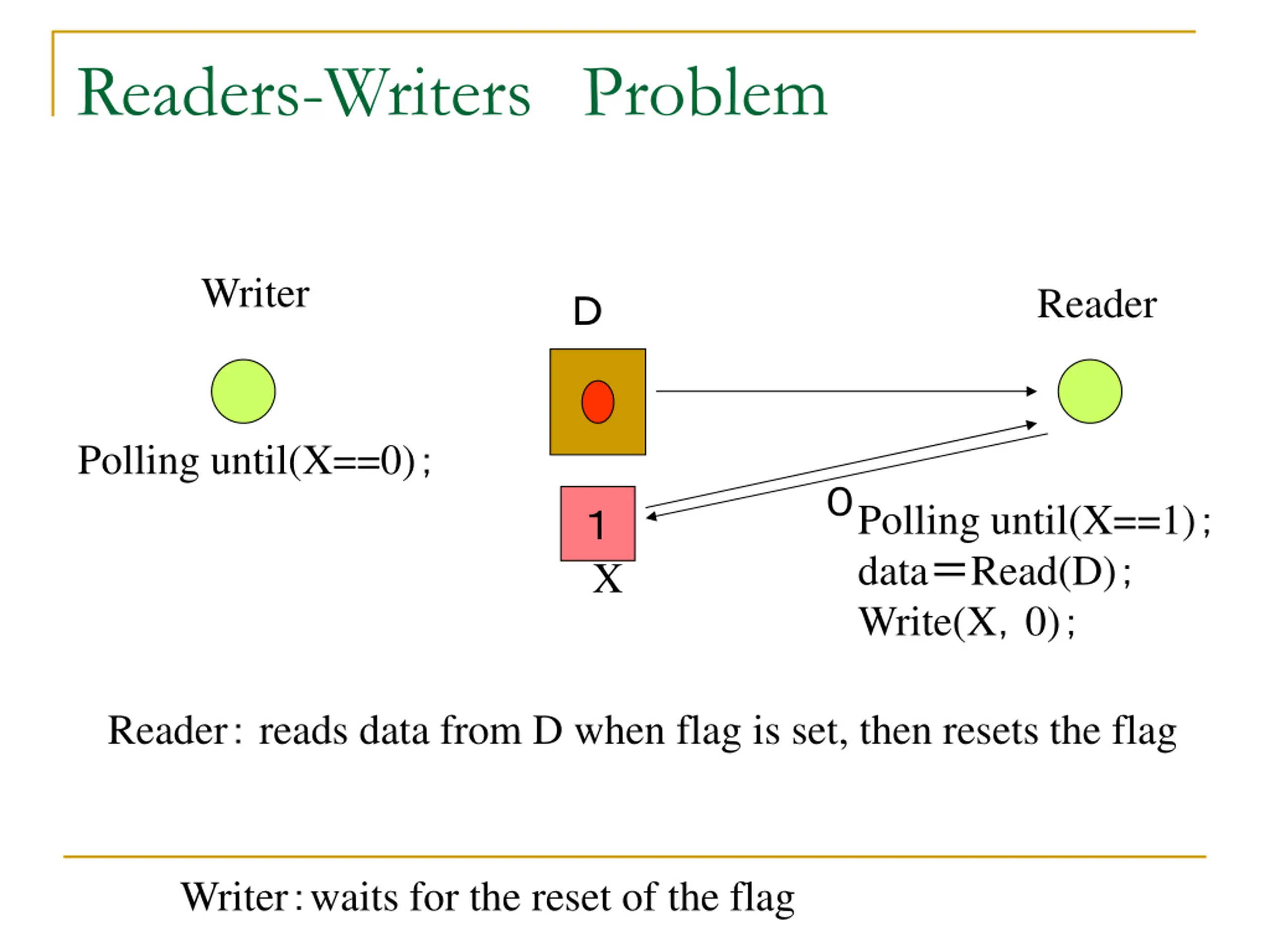 Revisit to Readers-Writers Problem Writer Reader D Polling until(X==1) Write(D Data) Write(X,1) X Writer writes data then sets the synchronization flag Reader waits until flag is set