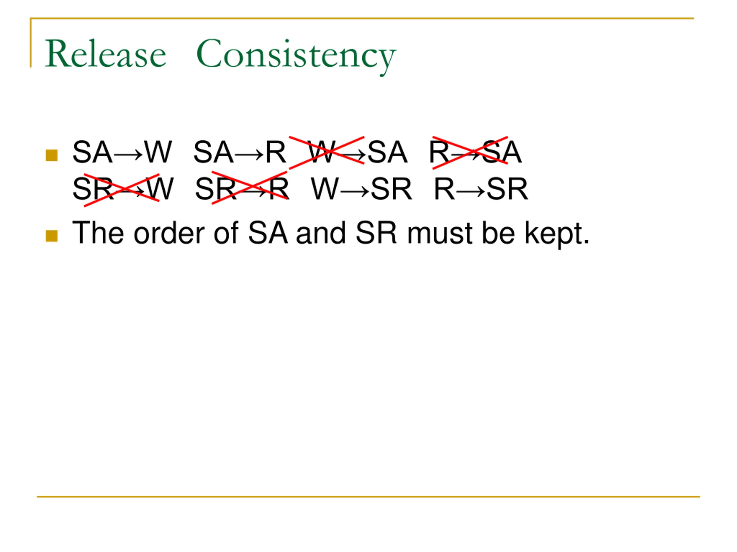 Release Consistency SA W SA R W SA R SA SR W SR R W SR R SR The order of SA and SR must be kept.