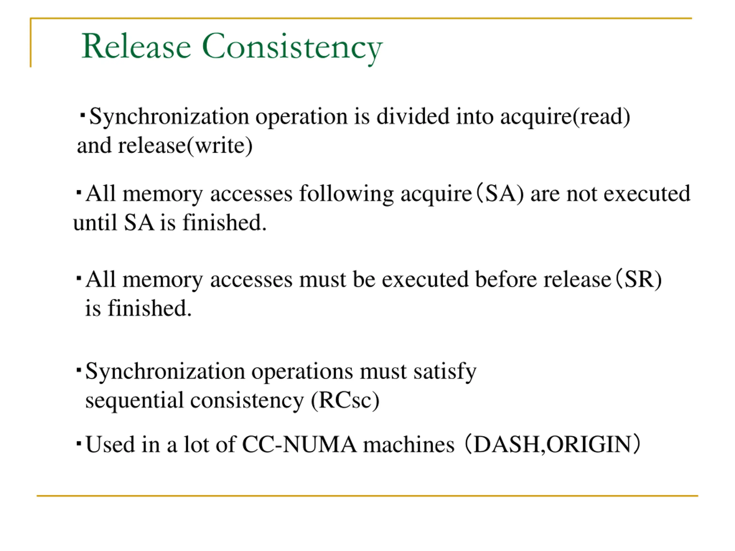 Release Consistency Synchronization operation is divided into acquire(read) and release(write) All memory accesses following acquire SA) are not executed until SA is finished. All memory accesses must be executed before release SR) is finished. Synchronization operations must satisfy sequential consistency (RCsc) Used in a lot of CC-NUMA machines DASH,ORIGIN
