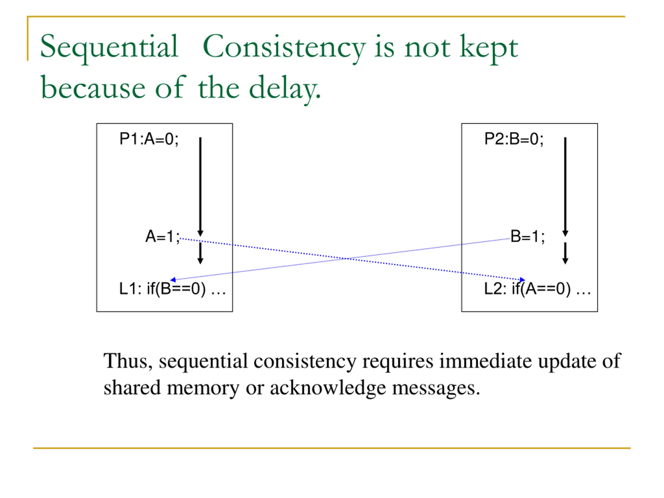 Sequential Consistency is not kept because of the delay. P1:A=0; P2:B=0; A=1; B=1; L1: if(B==0) L2: if(A==0) Thus, sequential consistency requires immediate update of shared memory or acknowledge messages.