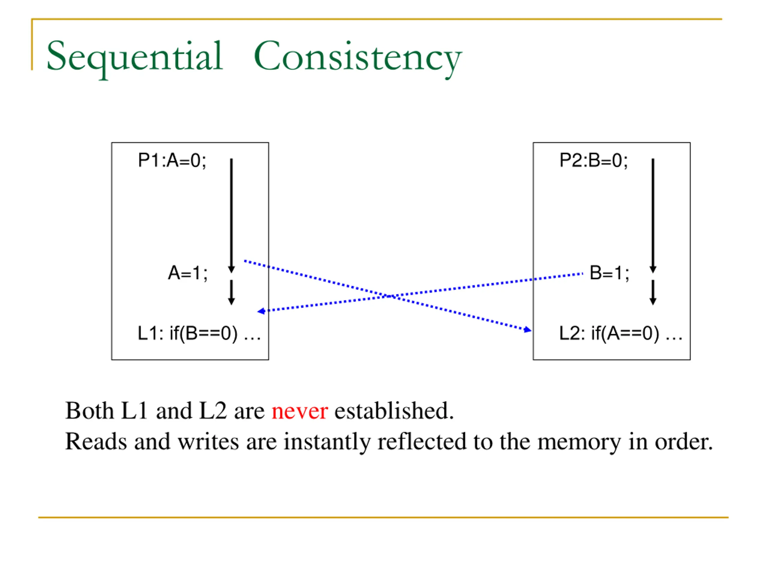 Sequential Consistency P1:A=0; P2:B=0; A=1; B=1; L1: if(B==0) L2: if(A==0) Both L1 and L2 are never established. Reads and writes are instantly reflected to the memory in order.