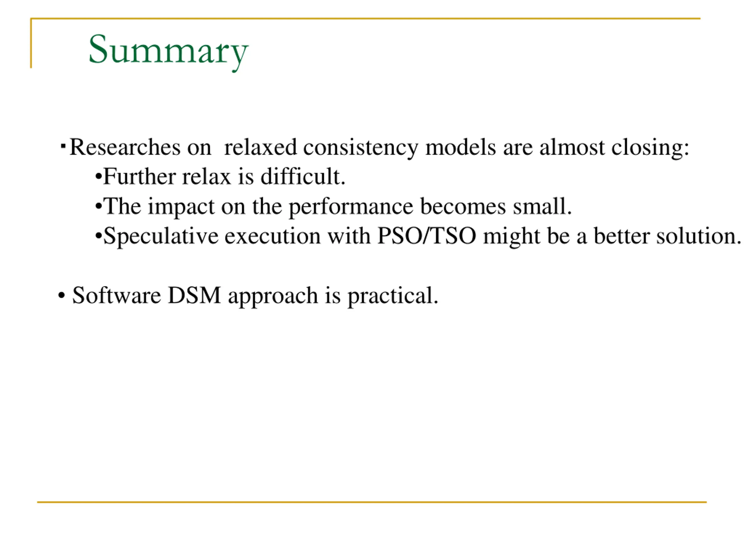 Summary Researches on relaxed consistency models are almost closing: Further relax is difficult. The impact on the performance becomes small. Speculative execution with PSO/TSO might be a better solution. Software DSM approach is practical.