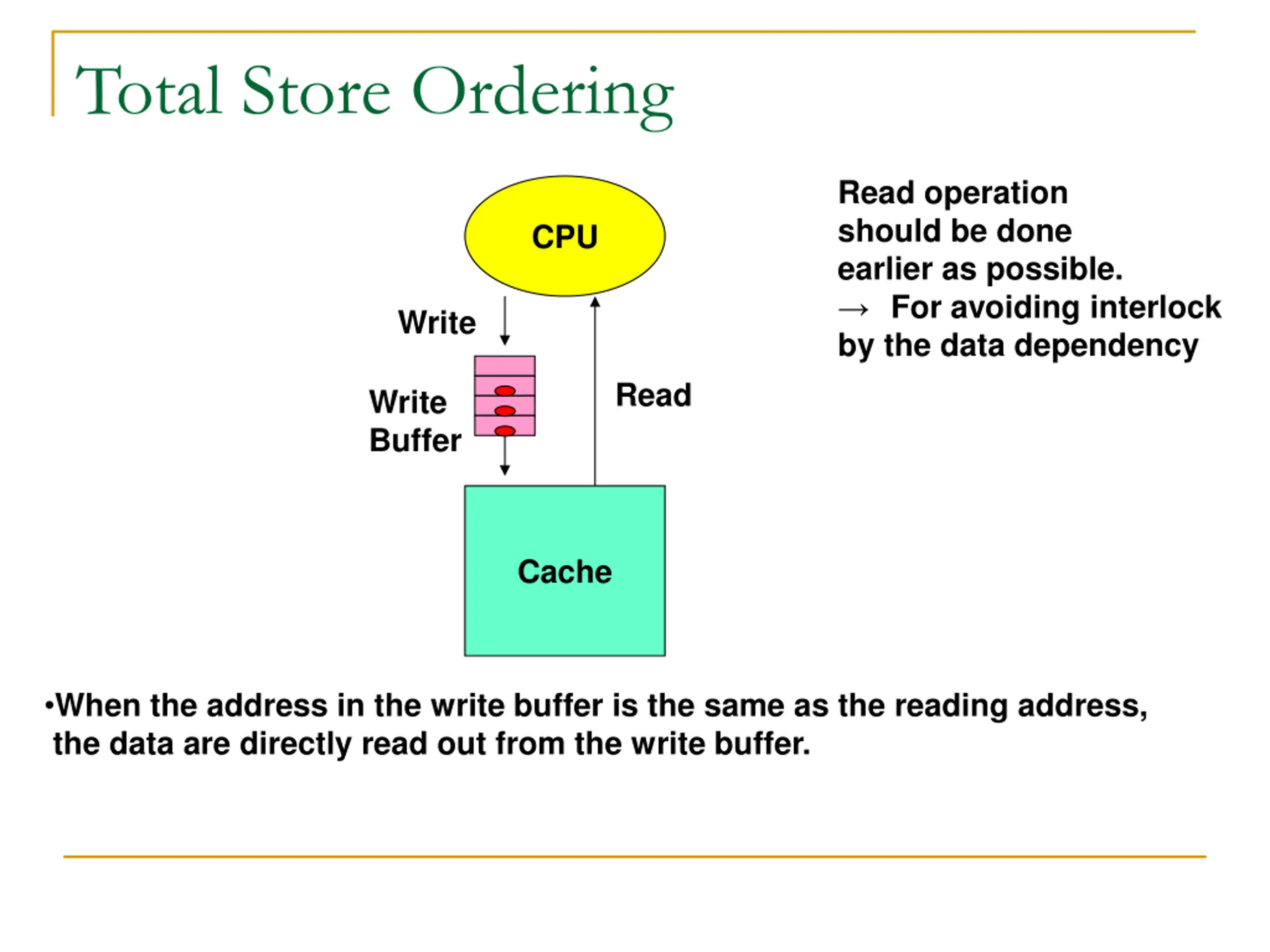 Total Store Ordering Read operation should be done earlier as possible. For avoiding interlock by the data dependency CPU Write Read Write Buffer Cache When the address in the write buffer is the same as the reading address, the data are directly read out from the write buffer.