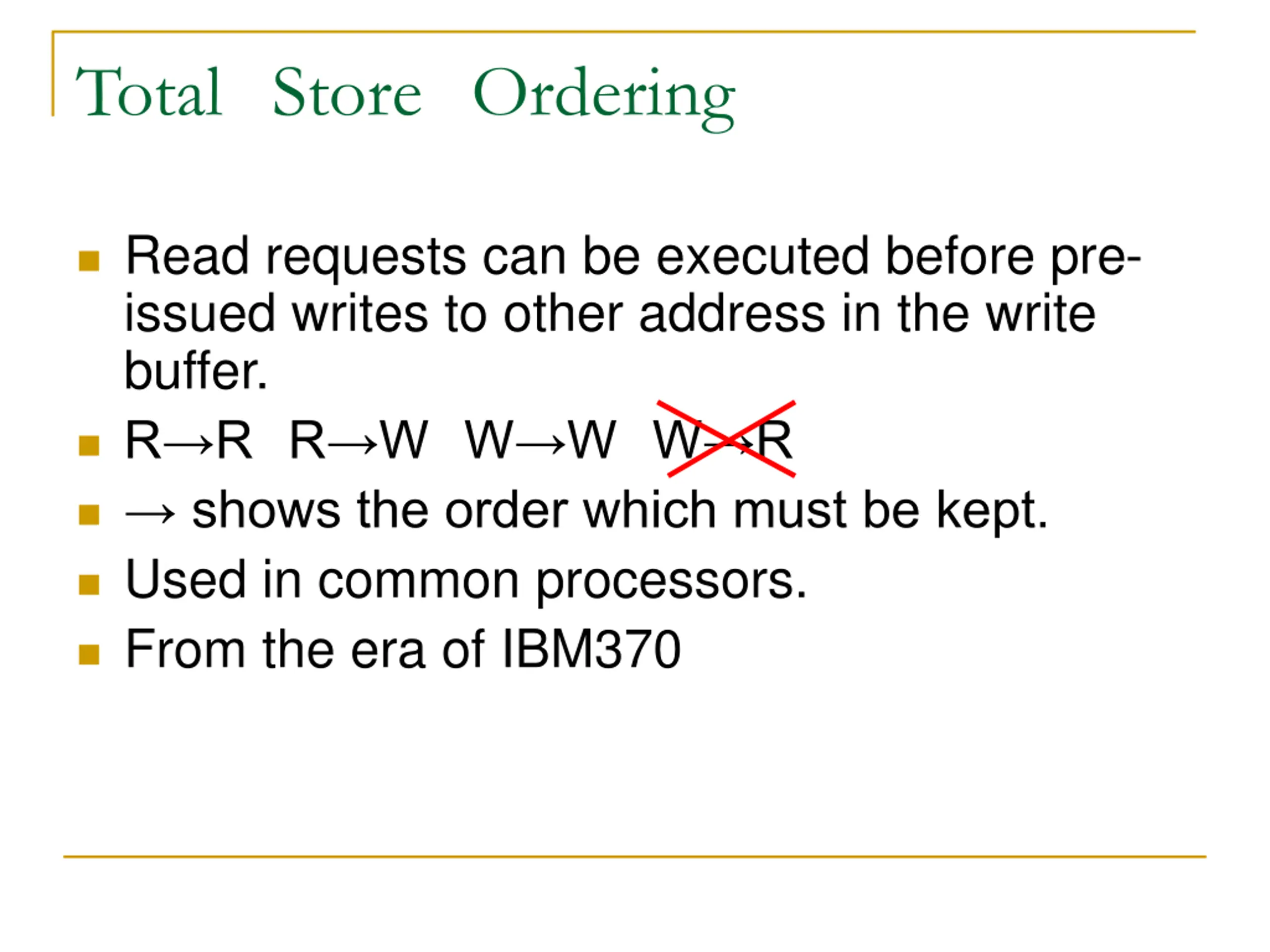 Total Store Ordering Read requests can be executed before pre- issued writes to other address in the write buffer. R R R W W W W R shows the order which must be kept. Used in common processors. From the era of IBM370