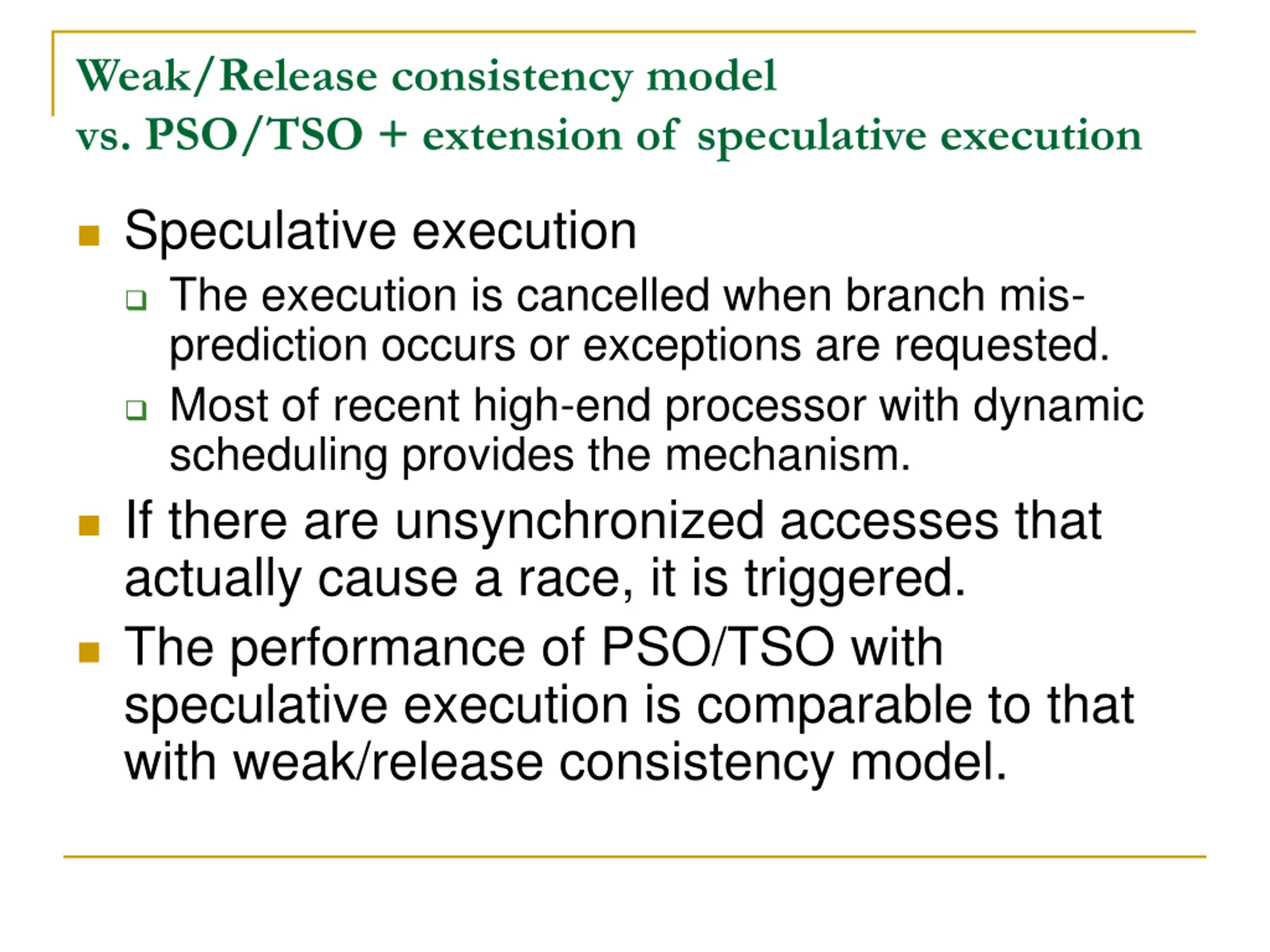 Weak/Release consistency model vs. PSO/TSO + extension of speculative execution Speculative execution The execution is cancelled when branch mis- prediction occurs or exceptions are requested. Most of recent high-end processor with dynamic scheduling provides the mechanism. If there are unsynchronized accesses that actually cause a race, it is triggered. The performance of PSO/TSO with speculative execution is comparable to that with weak/release consistency model.