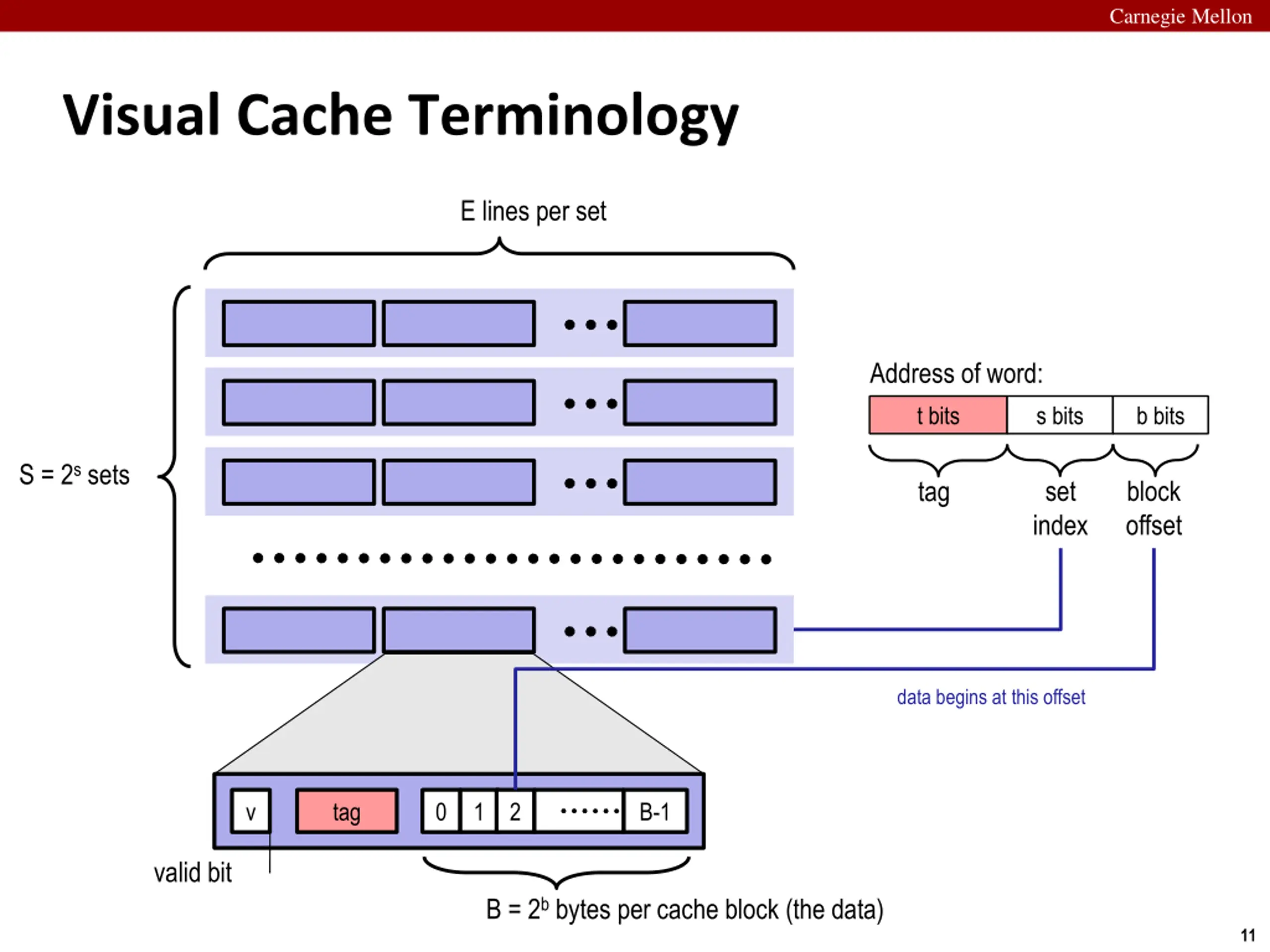 Carnegie Mellon Visual Cache Terminology E lines per set Address of word: t bits s bits b bits S = 2s sets set index block offset tag data begins at this offset v tag 0 1 2 B-1 valid bit B = 2b bytes per cache block (the data) 11