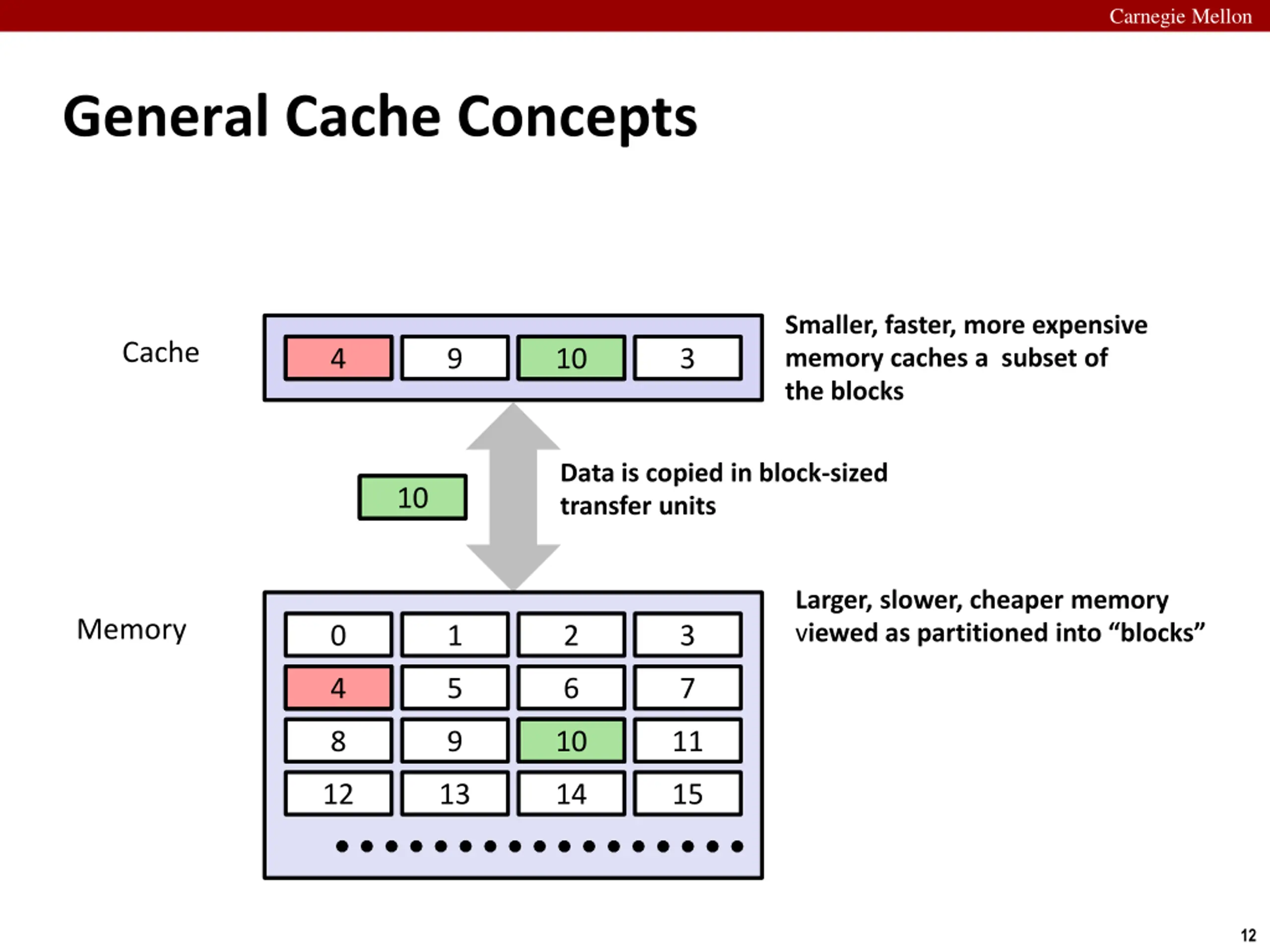 Carnegie Mellon General Cache Concepts Smaller, faster, more expensive memory caches a subset of the blocks Cache 8 4 9 14 10 3 Data is copied in block-sized transfer units 4 10 Larger, slower, cheaper memory viewed as partitioned into blocks Memory 0 1 2 3 4 4 5 6 7 8 9 10 10 11 12 13 14 15 12
