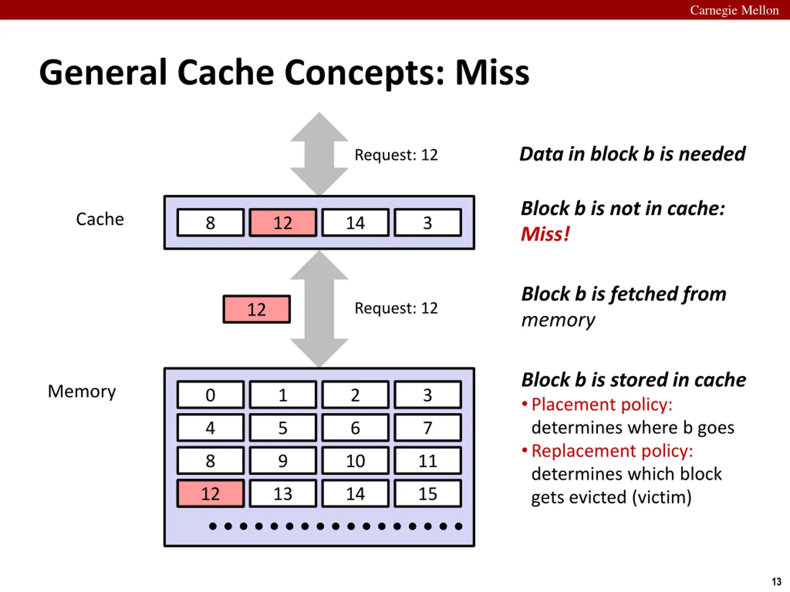 Carnegie Mellon General Cache Concepts: Miss Data in block b is needed Request: 12 Block b is not in cache: Miss! Cache 8 9 12 14 3 Block b is fetched from memory Request: 12 12 Block b is stored in cache Placement policy: determines where b goes Replacement policy: determines which block gets evicted (victim) Memory 0 1 2 3 4 5 6 7 8 9 10 11 12 12 13 14 15 13