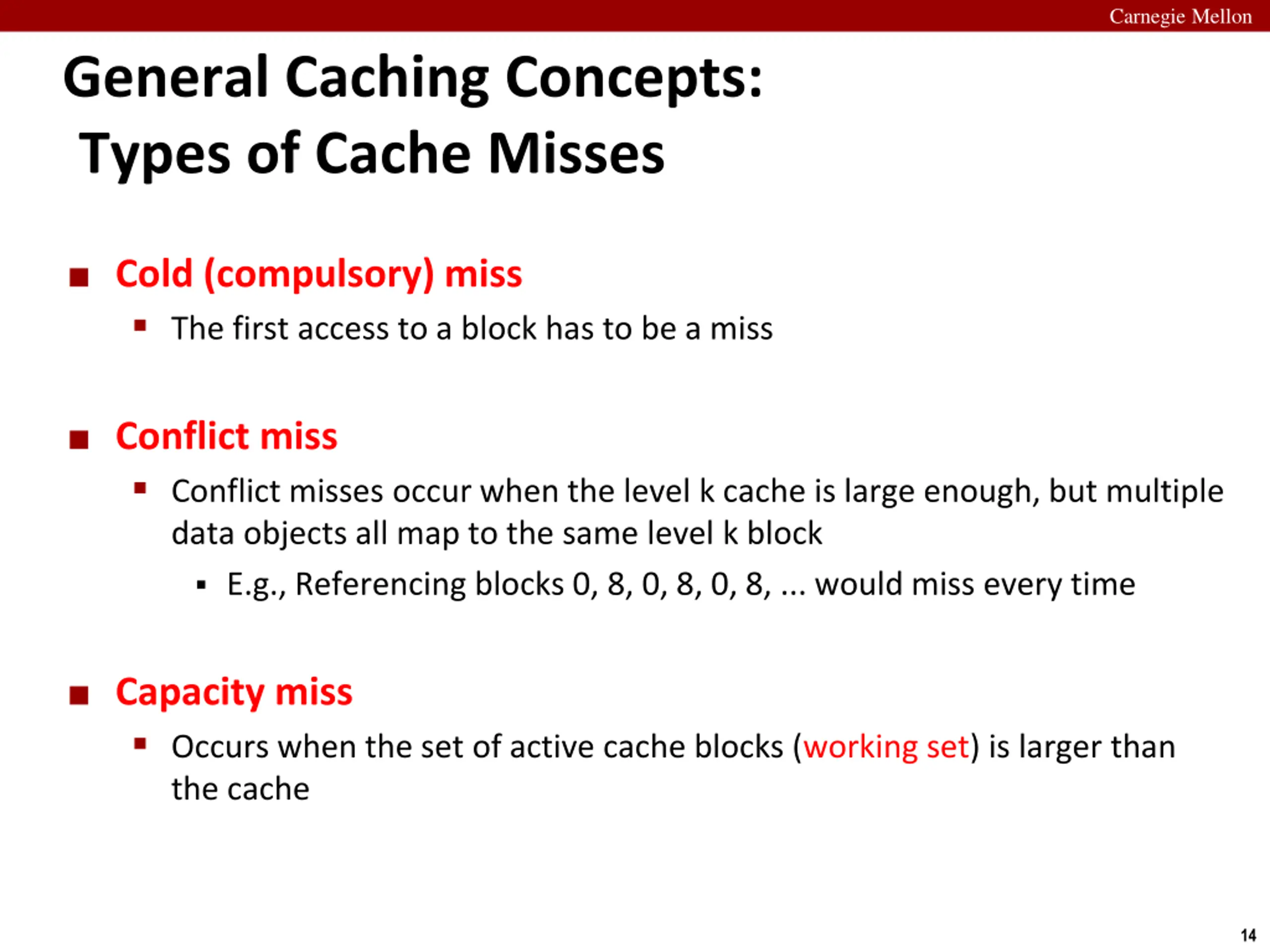 Carnegie Mellon General Caching Concepts: Types of Cache Misses Cold (compulsory) miss The first access to a block has to be a miss Conflict miss Conflict misses occur when the level k cache is large enough, but multiple data objects all map to the same level k block E.g., Referencing blocks 0, 8, 0, 8, 0, 8, ... would miss every time Capacity miss Occurs when the set of active cache blocks (working set) is larger than the cache 14