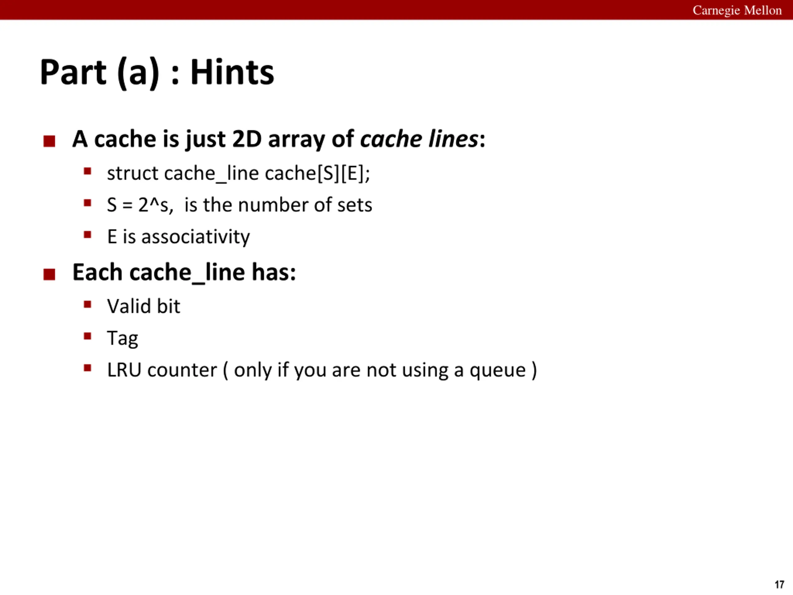 Carnegie Mellon Part (a) : Hints A cache is just 2D array of cache lines: struct cache_line cache[S][E]; S = 2^s, is the number of sets E is associativity Each cache_line has: Valid bit Tag LRU counter ( only if you are not using a queue ) 17