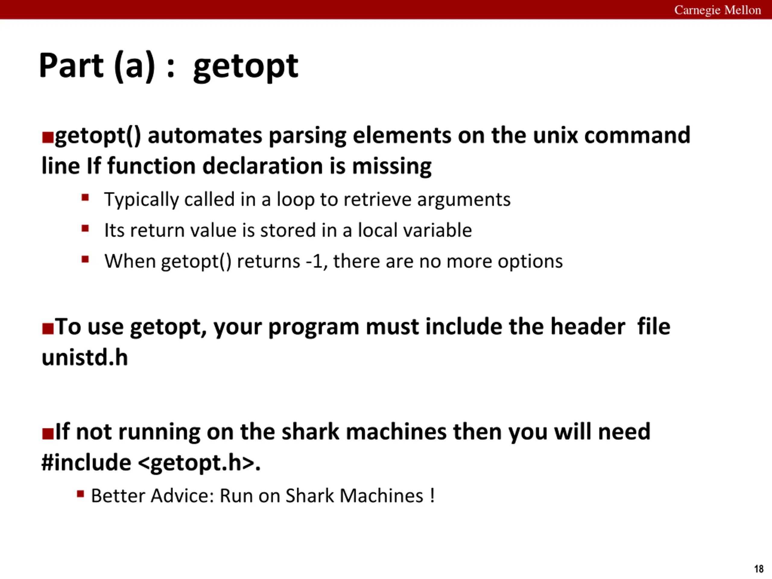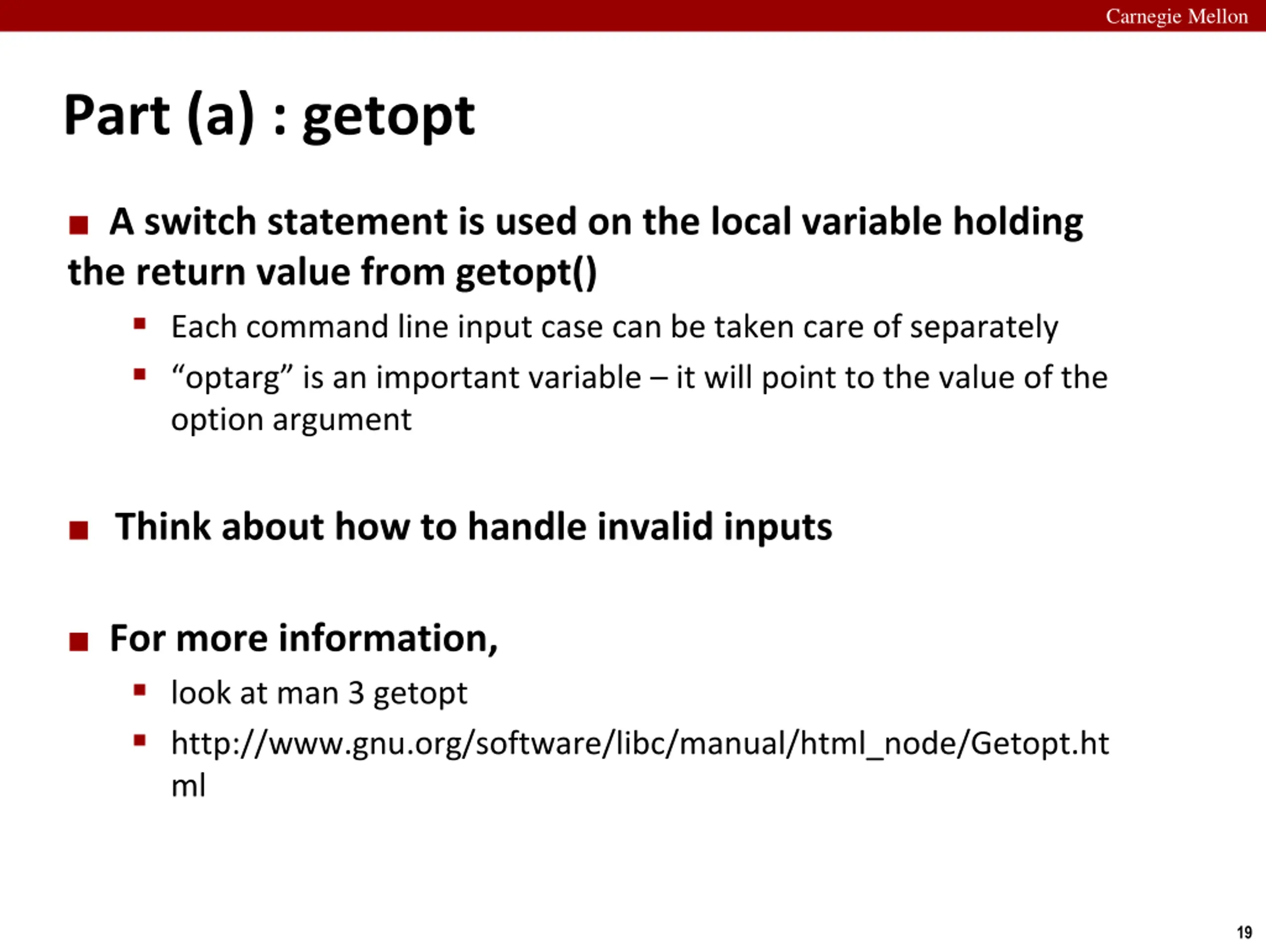 Carnegie Mellon Part (a) : getopt getopt() automates parsing elements on the unix command line If function declaration is missing Typically called in a loop to retrieve arguments Its return value is stored in a local variable When getopt() returns -1, there are no more options To use getopt, your program must include the header file unistd.h If not running on the shark machines then you will need #include <getopt.h>. Better Advice: Run on Shark Machines ! 18