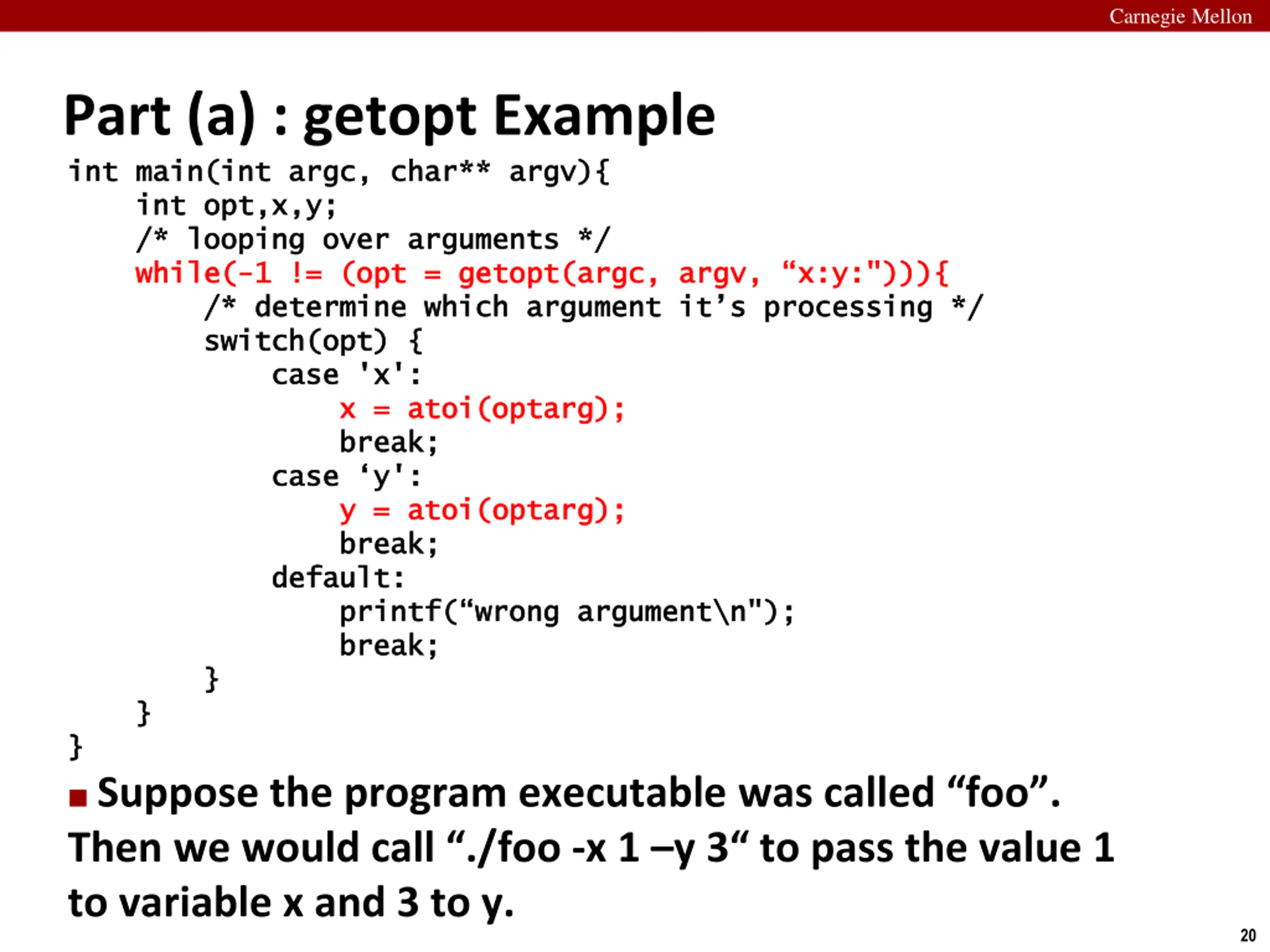 Carnegie Mellon Part (a) : getopt Example int int main( main(int int argc argc, char** , char** argv int int opt,x,y opt,x,y; ; /* looping /* looping over over arguments */ while while( (- -1 != (opt = 1 != (opt = getopt(argc /* determine /* determine which argument it s switch(opt switch(opt) { ) { case case 'x': 'x': x = x = atoi atoi( (optarg break; break; case case y y': ': y y = = atoi(optarg atoi(optarg); break; break; default default: : printf printf( wrong argument break; break; } } } } } } Suppose the program executable was called foo . Then we would call ./foo -x 1 y 3 to pass the value 1 to variable x and 3 to y. argv){ ){ arguments */ getopt(argc, which argument it s processing */ , argv argv, , x:y processing */ x:y:"))){ :"))){ optarg); ); ); ( wrong argument\ \n n"); "); 20