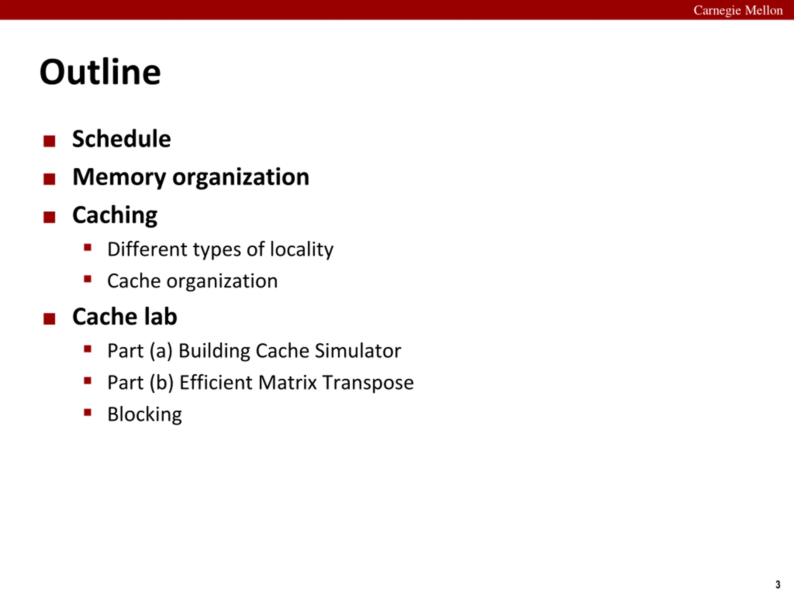 Carnegie Mellon Outline Schedule Memory organization Caching Different types of locality Cache organization Cache lab Part (a) Building Cache Simulator Part (b) Efficient Matrix Transpose Blocking 3