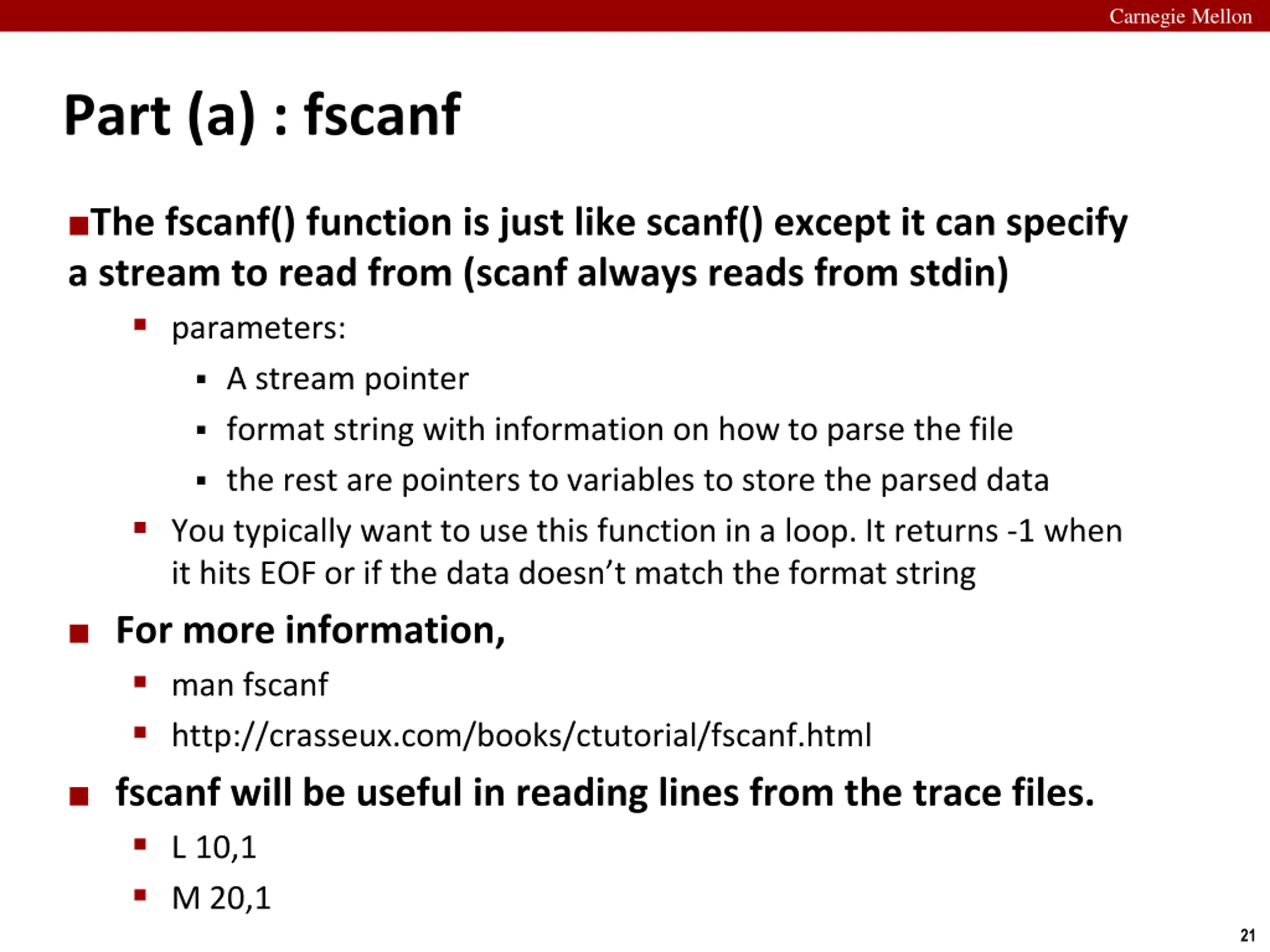 Carnegie Mellon Part (a) : fscanf The fscanf() function is just like scanf() except it can specify a stream to read from (scanf always reads from stdin) parameters: A stream pointer format string with information on how to parse the file the rest are pointers to variables to store the parsed data You typically want to use this function in a loop. It returns -1 when it hits EOF or if the data doesn t match the format string For more information, man fscanf http://crasseux.com/books/ctutorial/fscanf.html fscanf will be useful in reading lines from the trace files. L 10,1 M 20,1 21