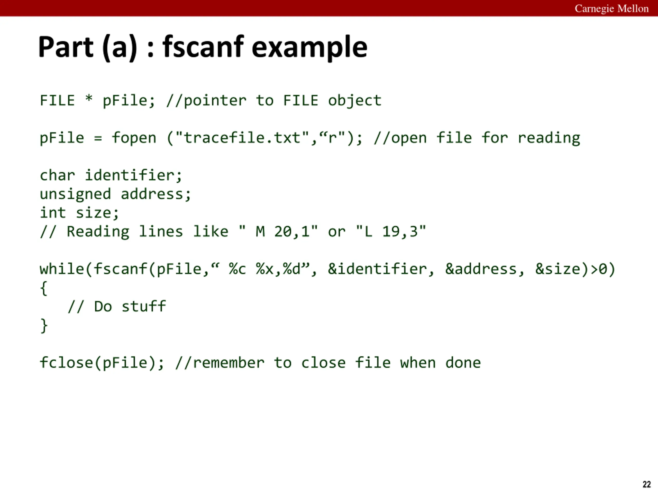 Carnegie Mellon Part (a) : fscanf example FILE * pFile; //pointer to FILE object pFile = fopen ("tracefile.txt", r"); //open file for reading char identifier; unsigned address; int size; // Reading lines like " M 20,1" or "L 19,3" while(fscanf(pFile, %c %x,%d , &identifier, &address, &size)>0) { // Do stuff } fclose(pFile); //remember to close file when done 22