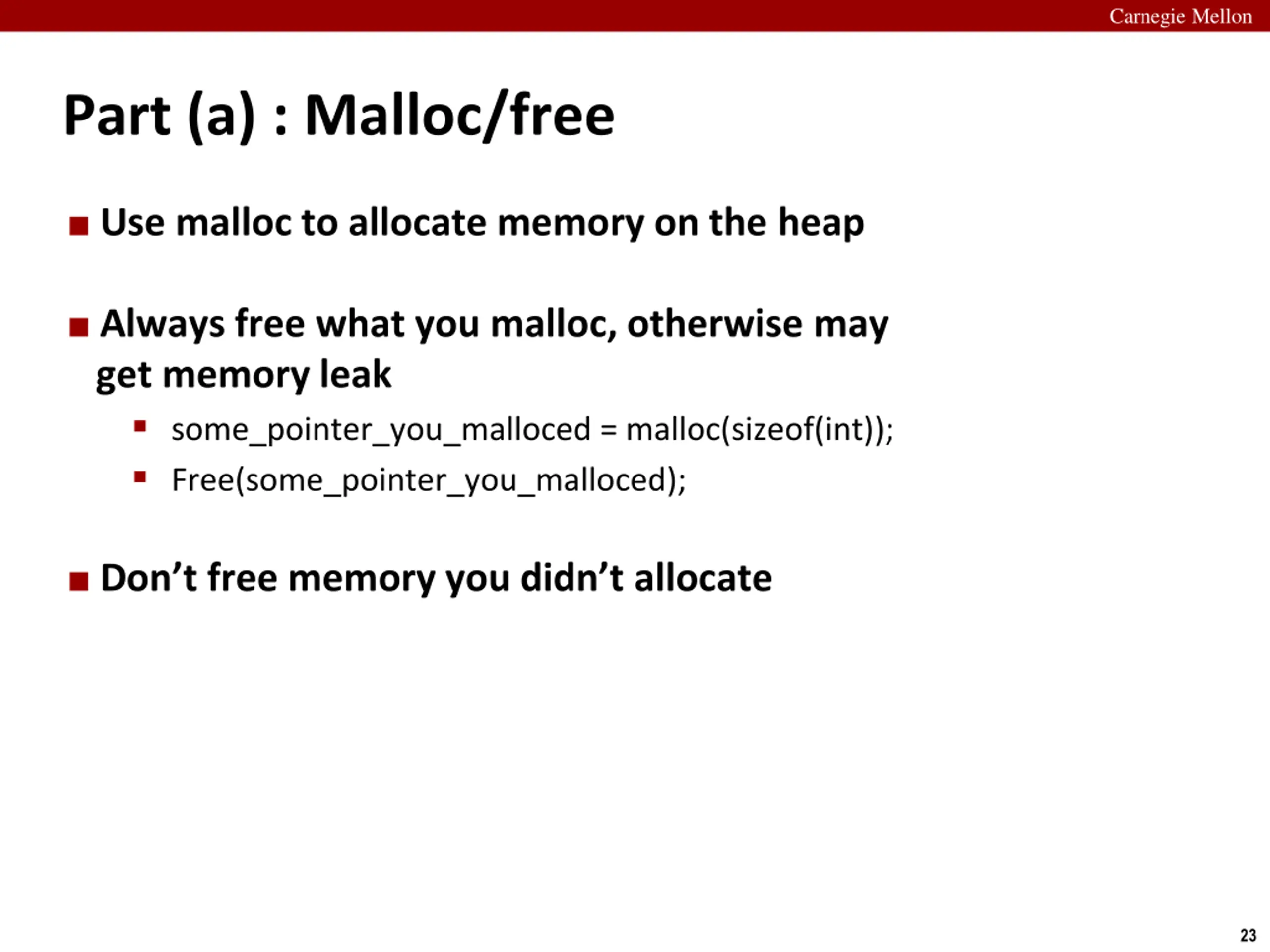 Carnegie Mellon Part (a) : Malloc/free Use malloc to allocate memory on the heap Always free what you malloc, otherwise may get memory leak some_pointer_you_malloced = malloc(sizeof(int)); Free(some_pointer_you_malloced); Don t free memory you didn t allocate 23